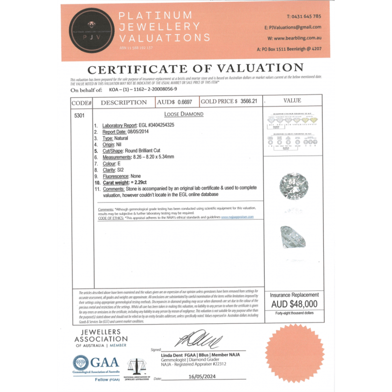 Round Brilliant Cut, E Colour, Si2 Clarity, Loose, Unset. Stone Comes With Egl International Report Egl #3404254325.