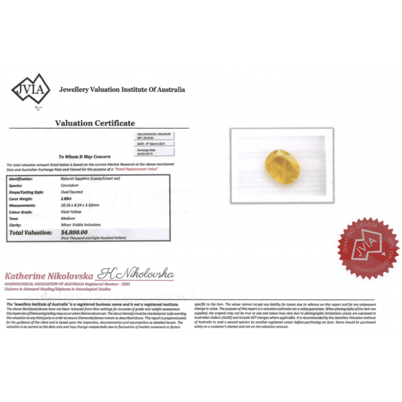 2.89CT NATURAL YELLOW SAPPHIRE Oval Faceted Cut, Medium Vivid Yellow, Minor Eye Visible Inclusions, Loose, Unset. Valuations Provided by an Independent Third-Party Professional Not Directly Associated With Lloyds Auctions at AUD $$4,800.00This valuation has been conducted by an independent third-party professional. The valuation amount is an assessment by the issuing valuer and does not reflect the auction value of the item. Any inquiries regarding the valuation should be directed to the issuing valuer (refer to contact details on the certificate), as Lloyds Auctions has no affiliation or influence over the valuation, the valuer, or the stated amount. Condition: Good - Refer Images 0645920+2129