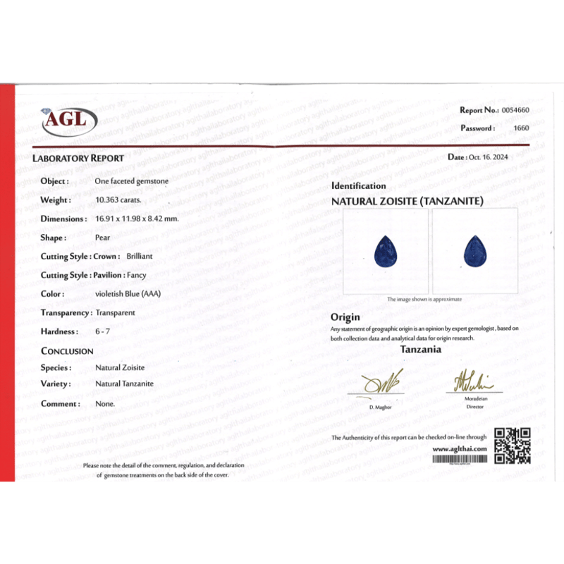 10.363CT CERTIFIED, NATURAL ZOISITE TANZANITE Pear Faceted Cut, Deep Violetish-Blue, Loose, Unset. Stone Comes Sealed With Agl Report: 0054660. Valuations Provided by an Independent Third-Party Professional Not Directly Associated With Lloyds Auctions at AUD $$18,820.00This valuation has been conducted by an independent third-party professional. The valuation amount is an assessment by the issuing valuer and does not reflect the auction value of the item. Any inquiries regarding the valuation should be directed to the issuing valuer (refer to contact details on the certificate), as Lloyds Auctions has no affiliation or influence over the valuation, the valuer, or the stated amount. Condition: Good - Refer Images 0645920+2141
