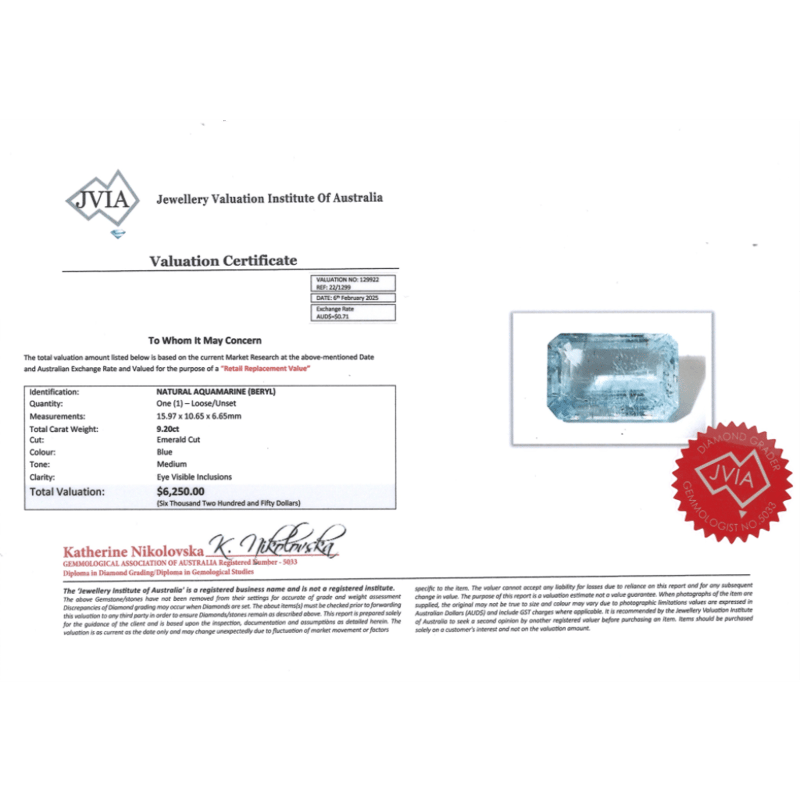 9.20CT NATURAL BERYL AQUAMARINE Emerald Cut, Medium Blue, Eye Visible Inclusions, Loose, Unset. Valuations Provided by an Independent Third-Party Professional Not Directly Associated With Lloyds Auctions at AUD $$6,250.00This valuation has been conducted by an independent third-party professional. The valuation amount is an assessment by the issuing valuer and does not reflect the auction value of the item. Any inquiries regarding the valuation should be directed to the issuing valuer (refer to contact details on the certificate), as Lloyds Auctions has no affiliation or influence over the valuation, the valuer, or the stated amount. Condition: Good - Refer Images 0645920+2144