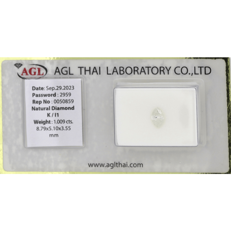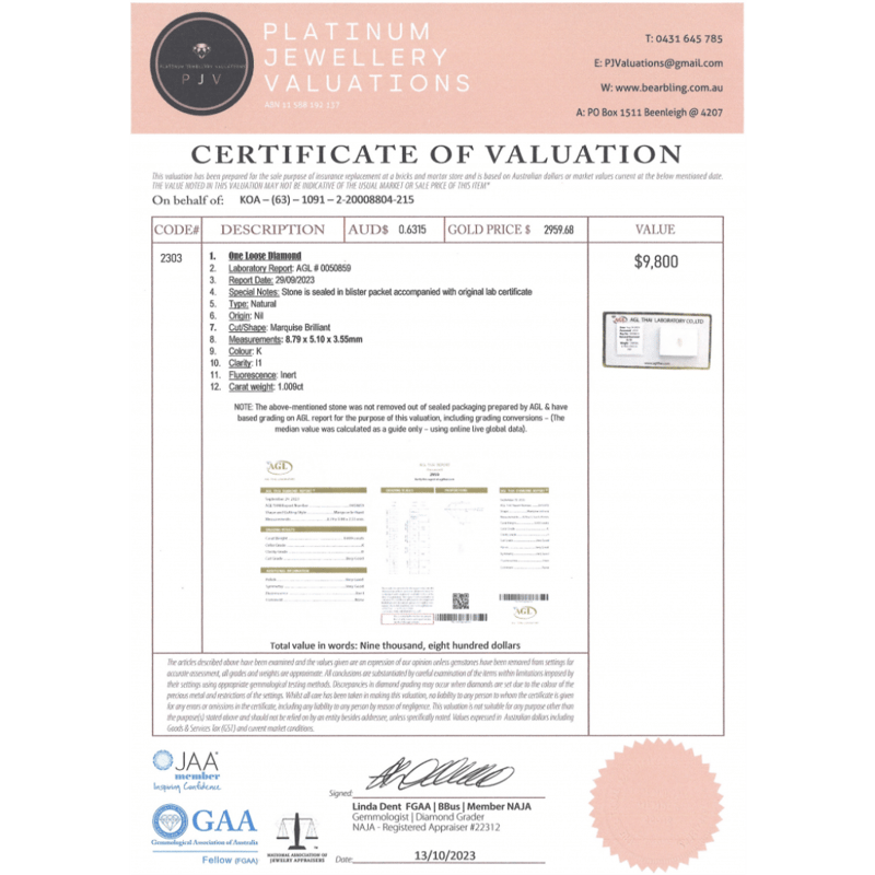 1.009CT CERTIFIED, NATURAL DIAMOND Marquise Brilliant Cut, K Colour, I1 Clarity, Loose, Unset. Stone Comes Sealed With Agl Report: 0050859. Valuations Provided by an Independent Third-Party Professional Not Directly Associated With Lloyds Auctions at AUD $$9,800.00This valuation has been conducted by an independent third-party professional. The valuation amount is an assessment by the issuing valuer and does not reflect the auction value of the item. Any inquiries regarding the valuation should be directed to the issuing valuer (refer to contact details on the certificate), as Lloyds Auctions has no affiliation or influence over the valuation, the valuer, or the stated amount. Condition: Good - Refer Images 0645920+2162