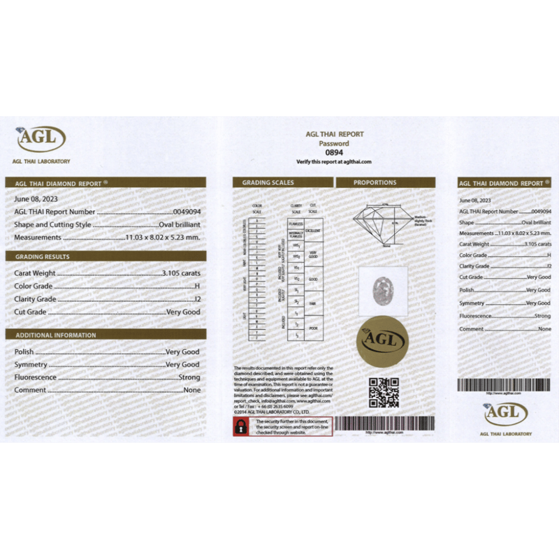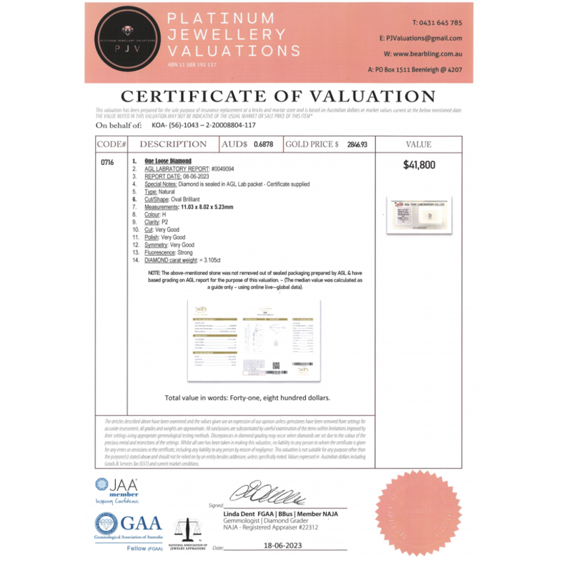 3.105CT CERTIFIED, NATURAL DIAMOND Oval Brilliant Cut, H Colour, P2 Clarity, Loose, Unset. Stone Comes Sealed With Agl Report: 0049094. Valuations Provided by an Independent Third-Party Professional Not Directly Associated With Lloyds Auctions at AUD $$41,800.00This valuation has been conducted by an independent third-party professional. The valuation amount is an assessment by the issuing valuer and does not reflect the auction value of the item. Any inquiries regarding the valuation should be directed to the issuing valuer (refer to contact details on the certificate), as Lloyds Auctions has no affiliation or influence over the valuation, the valuer, or the stated amount. Condition: Good - Refer Images 0645924+2201