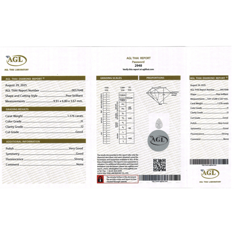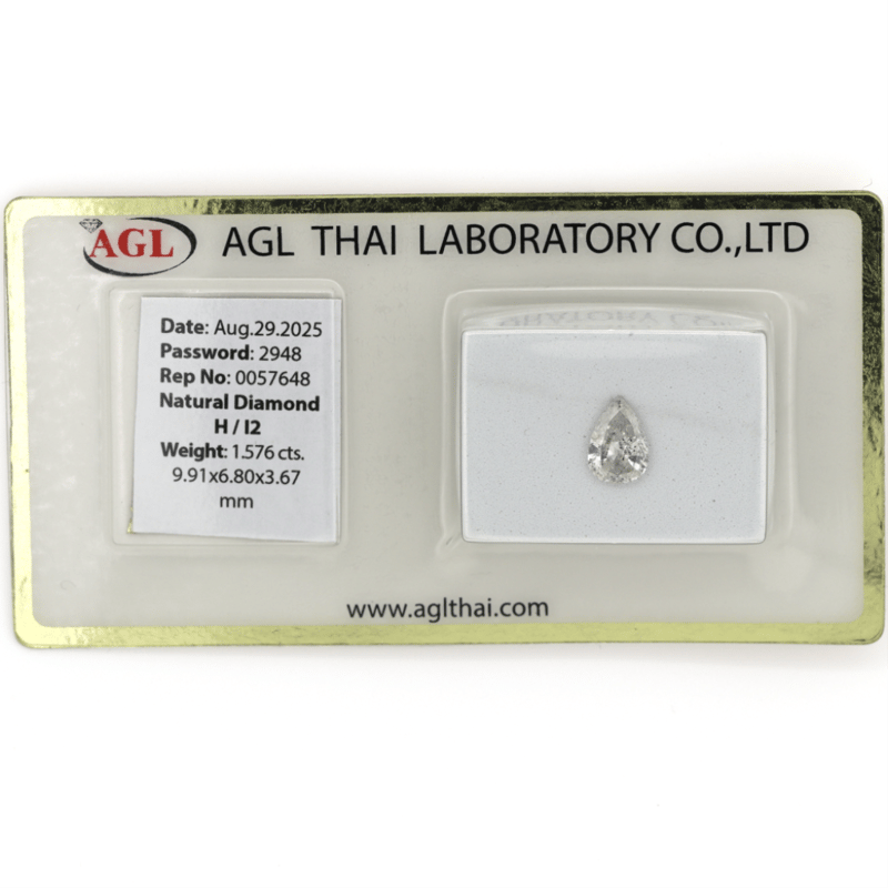 1.576CT CERTIFIED, NATURAL DIAMOND Pear Brilliant Cut, H Colour, I2 Clarity, Loose, Unset. Stone Comes Sealed With Agl Report: 0057648. Valuations Provided by an Independent Third-Party Professional Not Directly Associated With Lloyds Auctions at AUD $$15,500.00This valuation has been conducted by an independent third-party professional. The valuation amount is an assessment by the issuing valuer and does not reflect the auction value of the item. Any inquiries regarding the valuation should be directed to the issuing valuer (refer to contact details on the certificate), as Lloyds Auctions has no affiliation or influence over the valuation, the valuer, or the stated amount. Condition: Good - Refer Images 0645924+2202