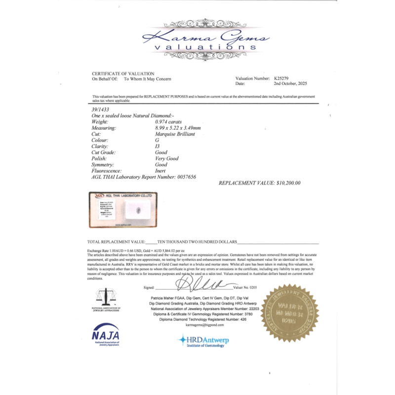Marquise Brilliant Cut, G Colour, I3 Clarity, Loose, Unset. Stone Comes Sealed With Agl Report: 0057656.