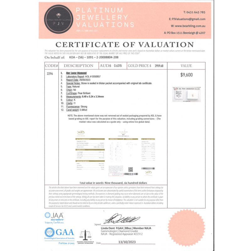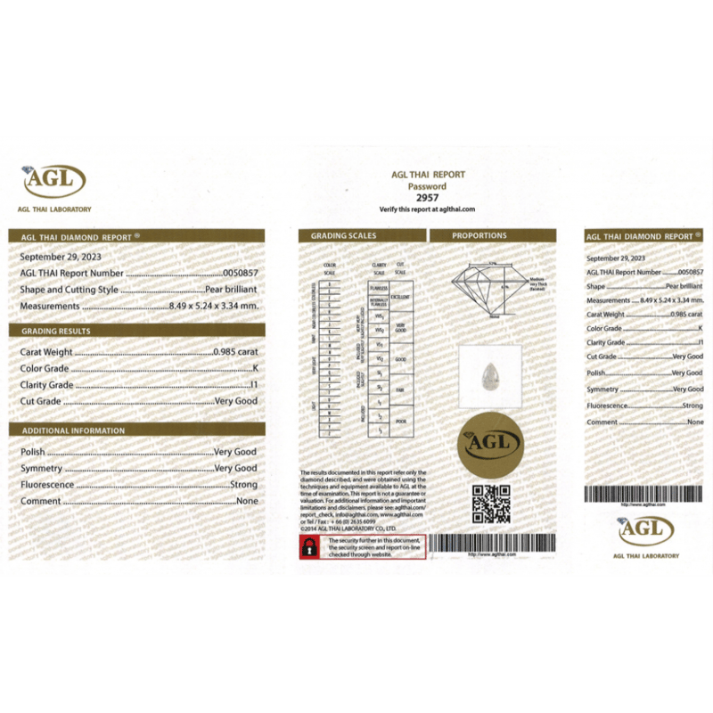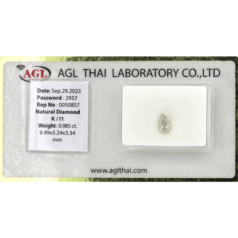 Pear Brilliant Cut, K Colour, I1 Clarity, Loose, Unset. Stone Comes Sealed With Agl Report: 0050857.