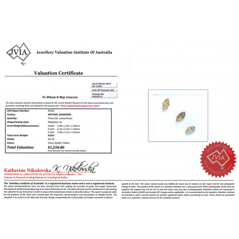 0.62CT TDW X 3, NATURAL FANCY GOLDEN YELLOW DIAMONDS Marquise Cut, Fancy Golden Yellow, Si2-P2 Clarity, Loose, Unset. Valuations Provided by an Independent Third-Party Professional Not Directly Associated With Lloyds Auctions at AUD $$1,250.00This valuation has been conducted by an independent third-party professional. The valuation amount is an assessment by the issuing valuer and does not reflect the auction value of the item. Any inquiries regarding the valuation should be directed to the issuing valuer (refer to contact details on the certificate), as Lloyds Auctions has no affiliation or influence over the valuation, the valuer, or the stated amount. Condition: Good - Refer Images 0645924+2214