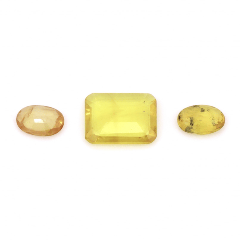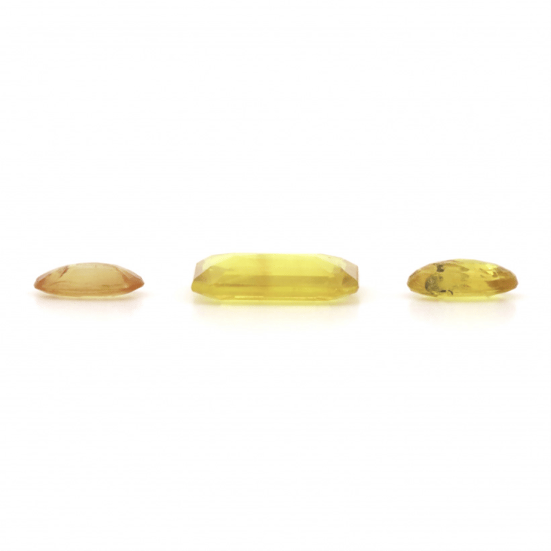 One Emerald Cut, 2 Oval Faceted Cut, Golden Yellow/Orangy Yellow, Minor Eye Visible Inclusions, Loose, Unset.