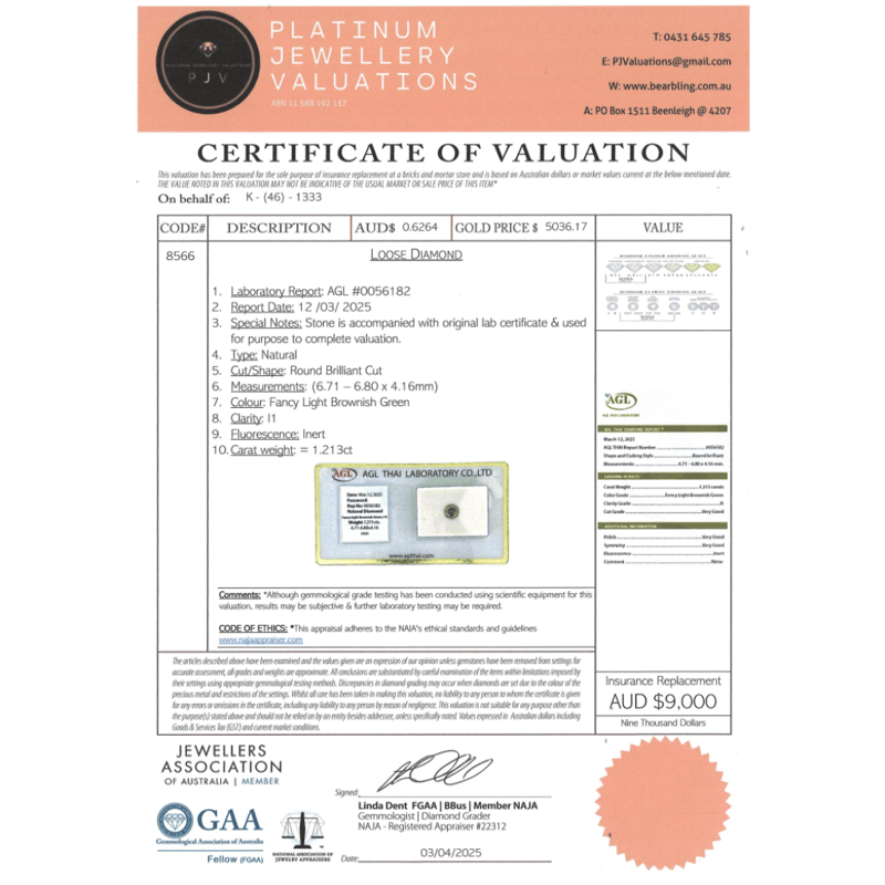 1.213CT CERTIFIED, NATURAL BROWN/GREEN DIAMOND Round Brilliant Cut, Fancy Light Brownish-Green Colour, I1 Clarity, Loose, Unset. Stone Comes Sealed With Agl Report: 0056182. Valuations Provided by an Independent Third-Party Professional Not Directly Associated With Lloyds Auctions at AUD $$9,000.00This valuation has been conducted by an independent third-party professional. The valuation amount is an assessment by the issuing valuer and does not reflect the auction value of the item. Any inquiries regarding the valuation should be directed to the issuing valuer (refer to contact details on the certificate), as Lloyds Auctions has no affiliation or influence over the valuation, the valuer, or the stated amount. Condition: Good - Refer Images 0645924+2252