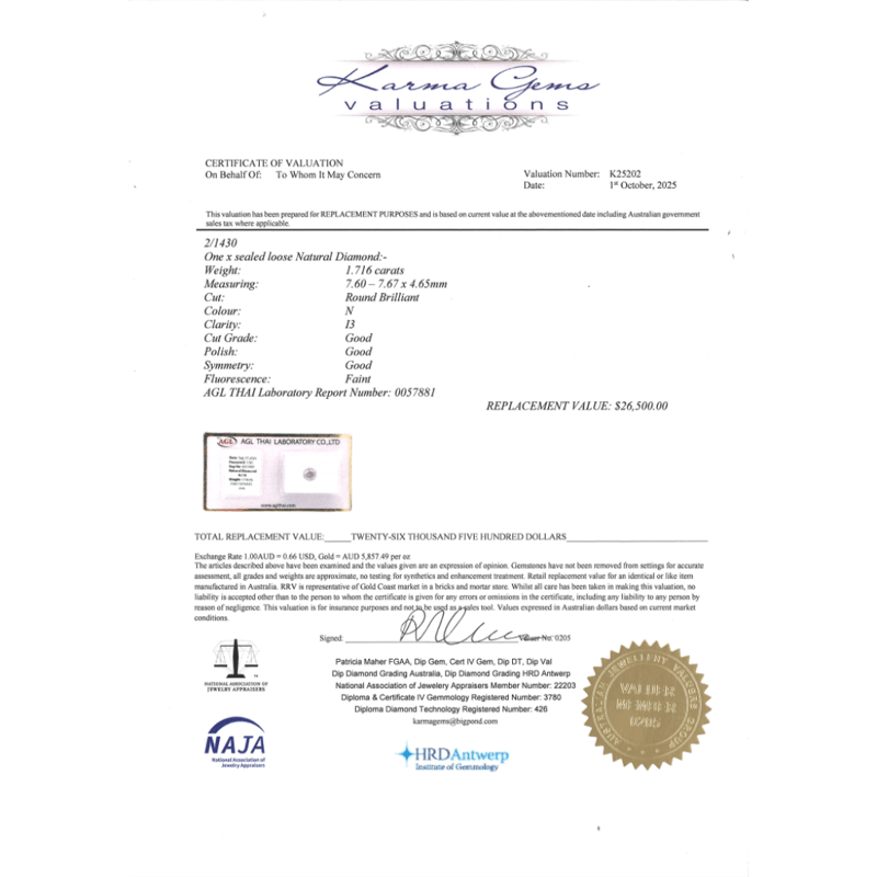 1.716CT CERTIFIED, NATURAL DIAMOND Round Brilliant Cut, N Colour, I3 Clarity, Loose, Unset. Stone Comes Sealed With Agl Report: 0057881. Valuations Provided by an Independent Third-Party Professional Not Directly Associated With Lloyds Auctions at AUD $$26,500.00This valuation has been conducted by an independent third-party professional. The valuation amount is an assessment by the issuing valuer and does not reflect the auction value of the item. Any inquiries regarding the valuation should be directed to the issuing valuer (refer to contact details on the certificate), as Lloyds Auctions has no affiliation or influence over the valuation, the valuer, or the stated amount. Condition: Good - Refer Images 0645924+2259