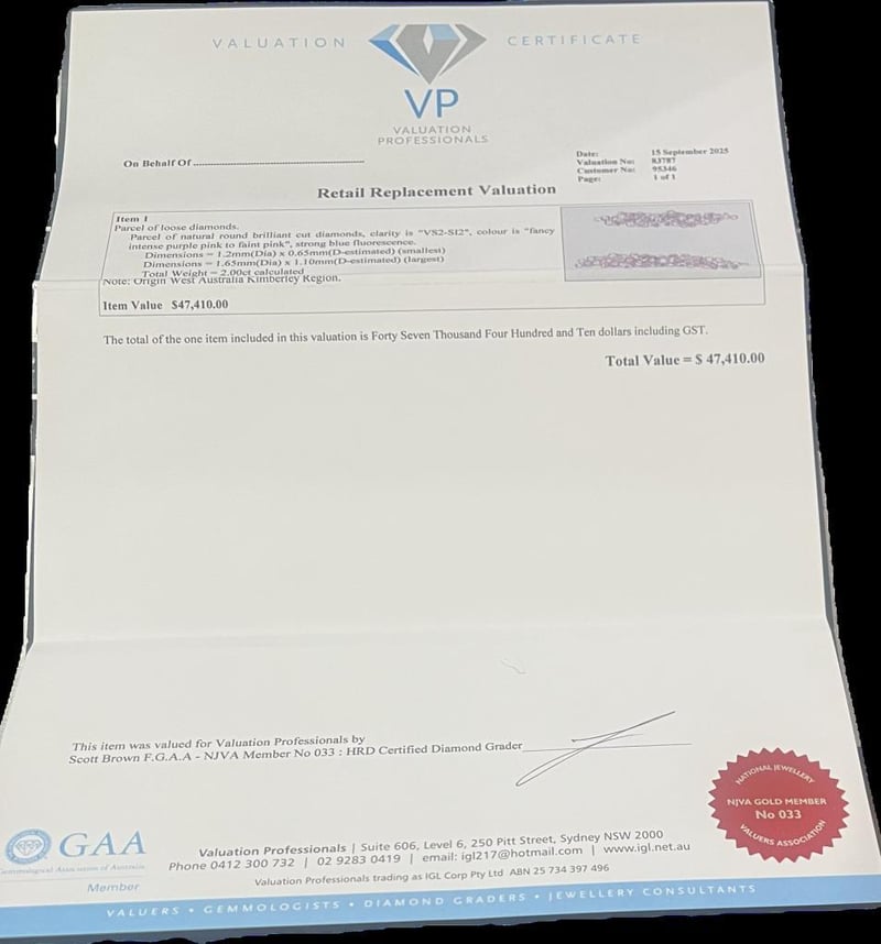 2.00 CARAT PINK ROUND DIAMOND Argyle Origin- Fancy Pink To Faint Pink Australias Kimberley Region Diamond With Vp Retail Valuation $47,410 Valuations Provided by an Independent Third-Party Professional Not Directly Associated With Lloyds Auctions at AUD $47410This valuation has been conducted by an independent third-party professional. The valuation amount is an assessment by the issuing valuer and does not reflect the auction value of the item. Any inquiries regarding the valuation should be directed to the issuing valuer (refer to contact details on the certificate), as Lloyds Auctions has no affiliation or influence over the valuation, the valuer, or the stated amount. Condition: Good - Refer Images 0311168+7