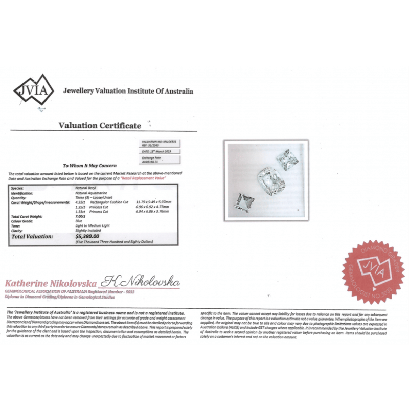 7.00CT TSW X 3, NATURAL AQUAMARINES One Rectangular Cushion Cut And 2 Princess Cut, Light-Medium Blue, Slightly Included, Loose, Unset. Valuations Provided by an Independent Third-Party Professional Not Directly Associated With Lloyds Auctions at AUD $$5,380.00This valuation has been conducted by an independent third-party professional. The valuation amount is an assessment by the issuing valuer and does not reflect the auction value of the item. Any inquiries regarding the valuation should be directed to the issuing valuer (refer to contact details on the certificate), as Lloyds Auctions has no affiliation or influence over the valuation, the valuer, or the stated amount. 0645928+2311