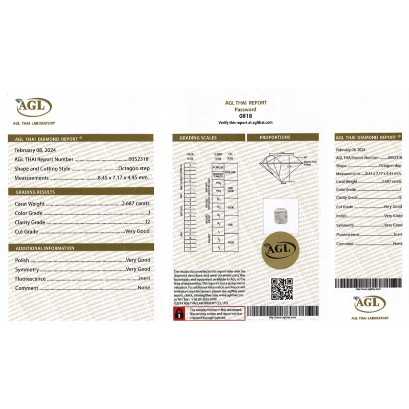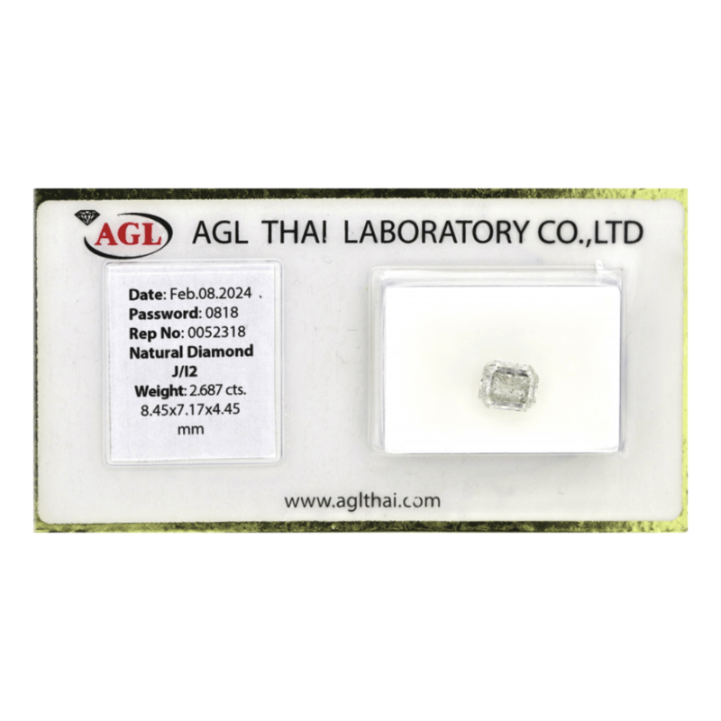 2.687CT CERTIFIED, NATURAL DIAMOND Octagon Step Cut, I Colour, I2 Clarity, Loose, Unset. Stone Comes Sealed With Agl Report: 0052318. Valuations Provided by an Independent Third-Party Professional Not Directly Associated With Lloyds Auctions at AUD $$26,850.00This valuation has been conducted by an independent third-party professional. The valuation amount is an assessment by the issuing valuer and does not reflect the auction value of the item. Any inquiries regarding the valuation should be directed to the issuing valuer (refer to contact details on the certificate), as Lloyds Auctions has no affiliation or influence over the valuation, the valuer, or the stated amount. 0645928+2330