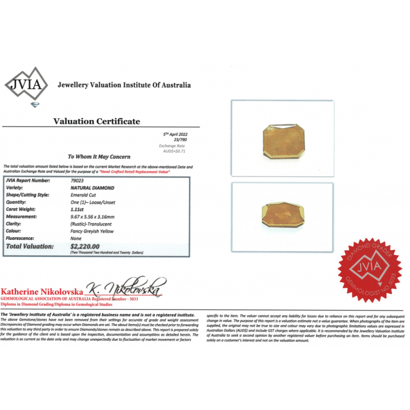 1.11CT NATURAL FANCY YELLOW DIAMOND Emerald Cut, Fancy Greyish-Yellow, Translucent, Loose, Unset. Valuations Provided by an Independent Third-Party Professional Not Directly Associated With Lloyds Auctions at AUD $$2,220.00This valuation has been conducted by an independent third-party professional. The valuation amount is an assessment by the issuing valuer and does not reflect the auction value of the item. Any inquiries regarding the valuation should be directed to the issuing valuer (refer to contact details on the certificate), as Lloyds Auctions has no affiliation or influence over the valuation, the valuer, or the stated amount. 0645928+2337