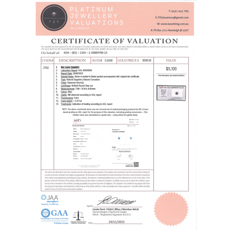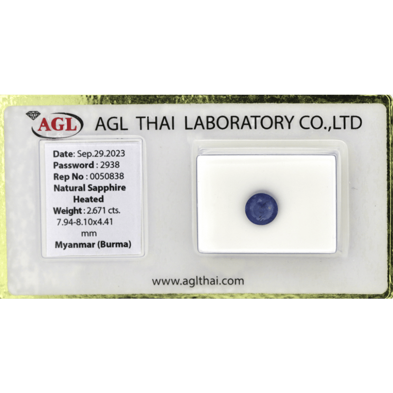 2.671CT CERTIFIED, NATURAL BLUE CORUNDUM SAPPHIRE Round Brilliant Step Cut, Blue, Indications Of Heat Treatment, Loose, Unset. Stone Comes Sealed With Agl Report: 0050838. Valuations Provided by an Independent Third-Party Professional Not Directly Associated With Lloyds Auctions at AUD $$5,100.00This valuation has been conducted by an independent third-party professional. The valuation amount is an assessment by the issuing valuer and does not reflect the auction value of the item. Any inquiries regarding the valuation should be directed to the issuing valuer (refer to contact details on the certificate), as Lloyds Auctions has no affiliation or influence over the valuation, the valuer, or the stated amount. 0645928+2339