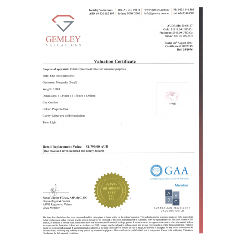 6.30CT NATURAL MORGANITE Cushion Cut, Light Purplish-Pink, Minor Eye Visible Inclusions, Loose, Unset. Valuations Provided by an Independent Third-Party Professional Not Directly Associated With Lloyds Auctions at AUD $$1,790.00This valuation has been conducted by an independent third-party professional. The valuation amount is an assessment by the issuing valuer and does not reflect the auction value of the item. Any inquiries regarding the valuation should be directed to the issuing valuer (refer to contact details on the certificate), as Lloyds Auctions has no affiliation or influence over the valuation, the valuer, or the stated amount. 0645928+2349