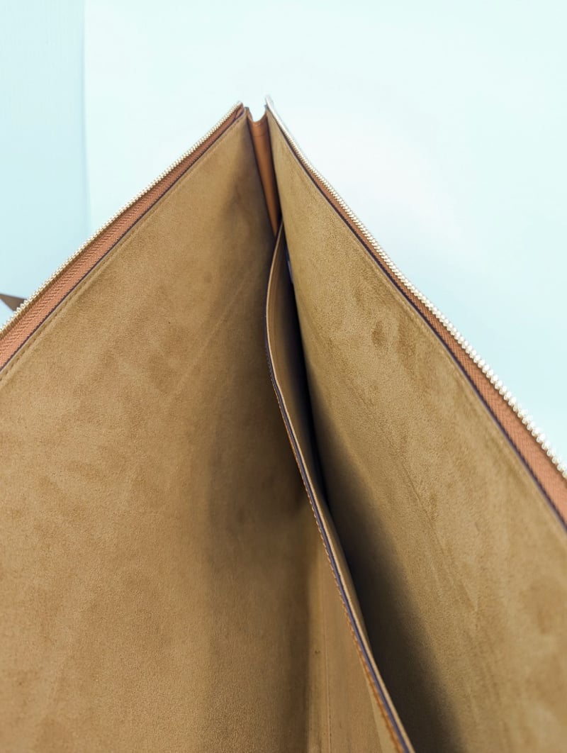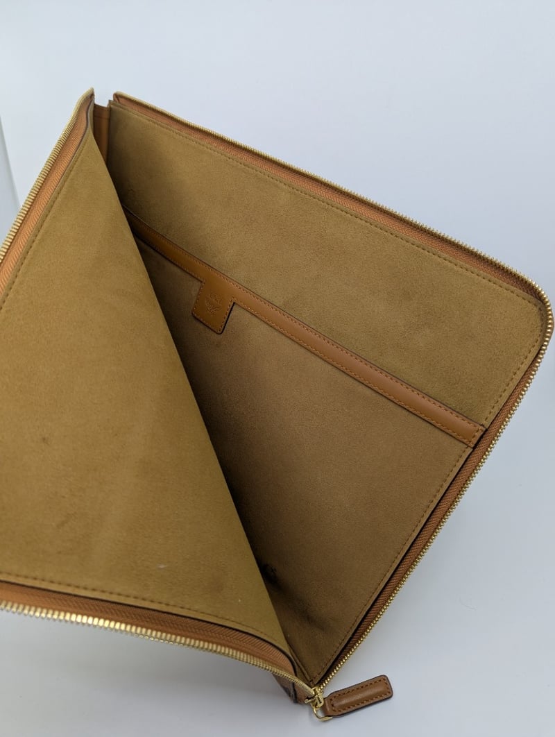 Cognac Leather Style Exterior, Zip Closure, Two Interior Compartment, Includes Dust Bag
