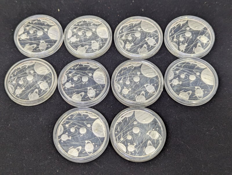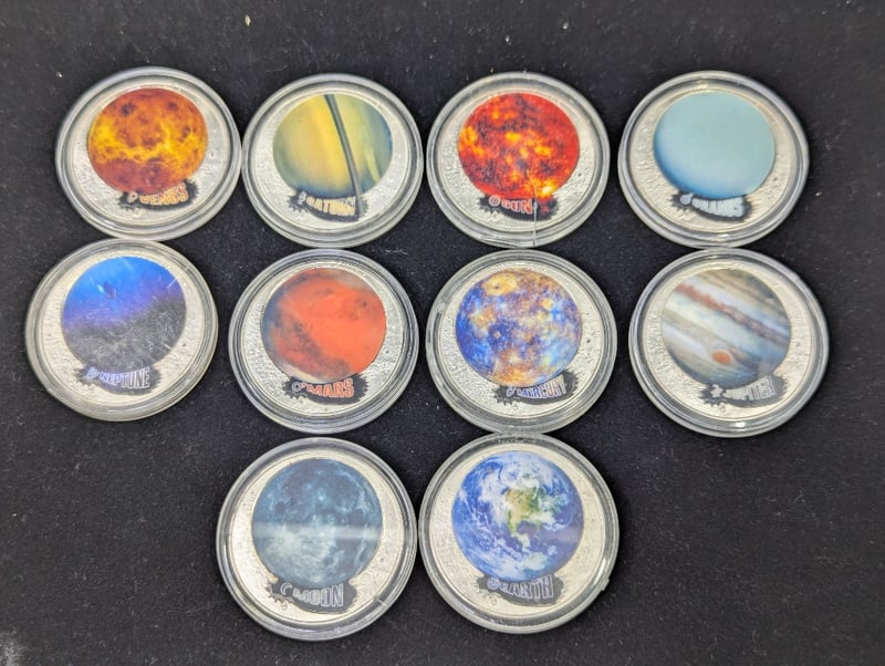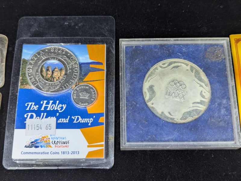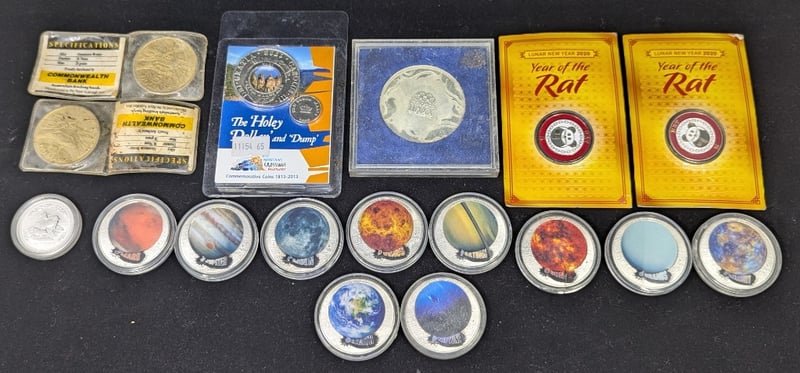 Includes 2003 1/2 Oz Silver Year Of The Goat Coin Two 1988 Parliament Five Dollar Coins, The Holey Dollar And Dump, Sydney 2000 Commemorative Medallion, Collection Of Solar System Token Coins, Two Year Of The Rat Medallions, Etc