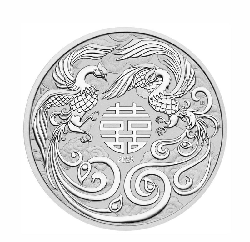 The coin portrays two crested birds gazing at one another with affection. Included in the design is the symbol double happiness, stylised representations of clouds, along with the 2025 year-date and The Perth Mint’s ‘P’ mintmark.