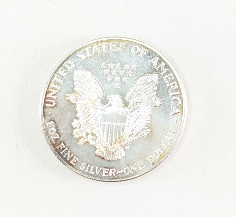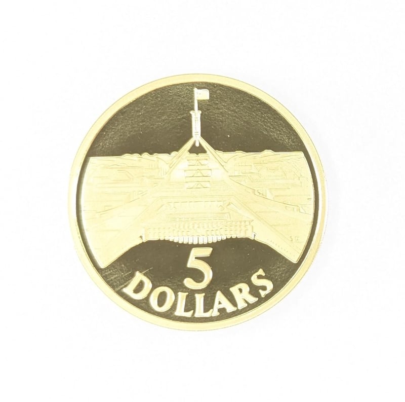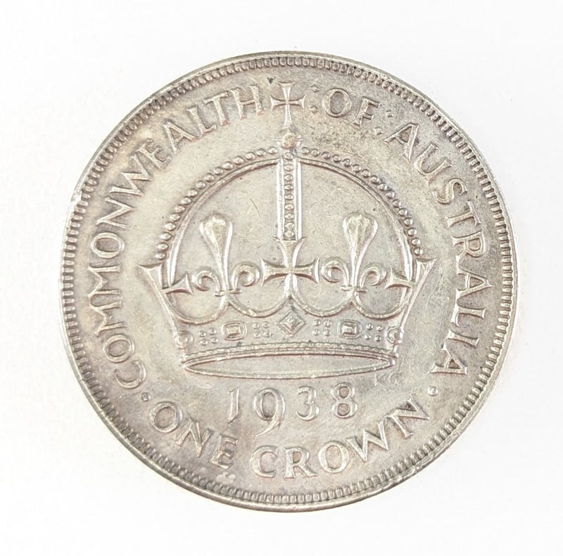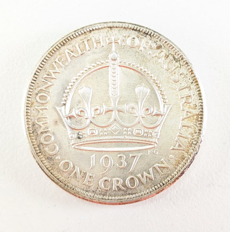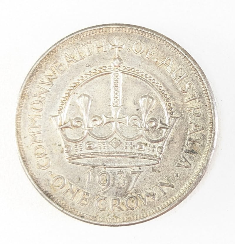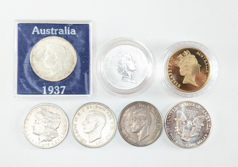 1937 Australian One Crown Silver Coins Qty 2, 1938 Australian One Crown Silver Coin Qty 1, 1988 Parliament House $5 Commemorative Coin, Silver Bullion Coin Of The United States Qty 1, 1878 One Dollar U.S.A Silver Coin, 1995 Australian 1 Oz Silver Kangaroo Coin.