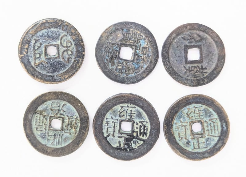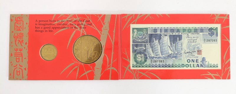 1991 Year Of The Goat Special Uncirculated Set With A $1 Coin, A Year Of The Goat Medallion, And A $1 Banknote, Qty 2. Ancient Chinese Coins From The Qing Dynasty (1644–1911 Ad). Singaporean Commemorative Coin, Likely A Proof Silver Coin, Featuring The National Coat Of Arms And The Year 2015.