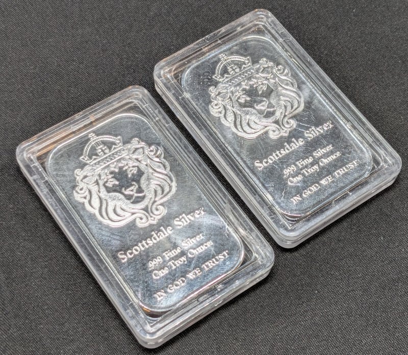 Includes Two Scottsdale .999 Silver Bars, 1981 Royal Australian Mint Proof Coin Set, 2022 Australian One Dollar Gold Coin: 150 Years Of The Overland Telegraph Lines, 2009 Australian Unc Twenty Cent Silver Coin: Australian Service Nurses Remembrance