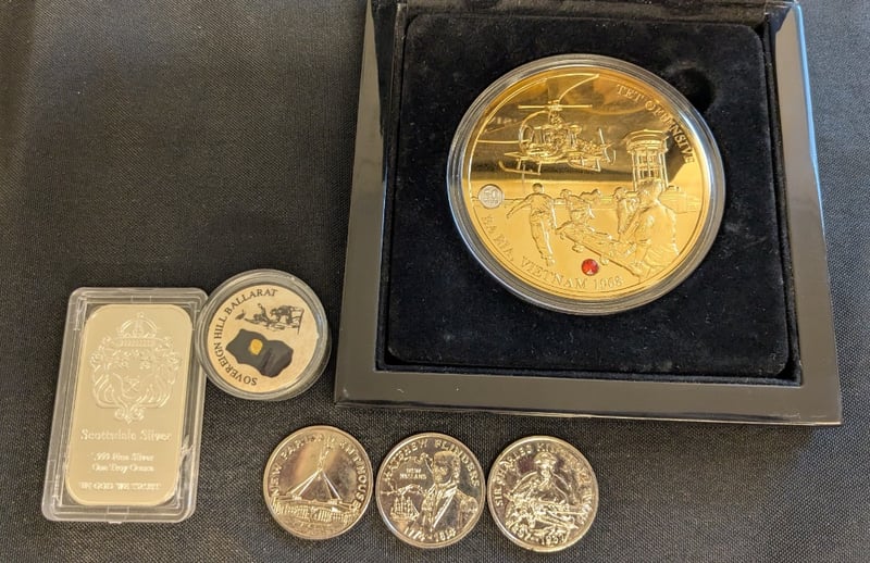 Includes Tet Offensive 50Th Anniversary Two Dollar Coin With Gems, Scottsdale .999 Silver Bar, Sovereign Hill Ballart Gold Nugget, Three Australian Bicentennial Coin Collection