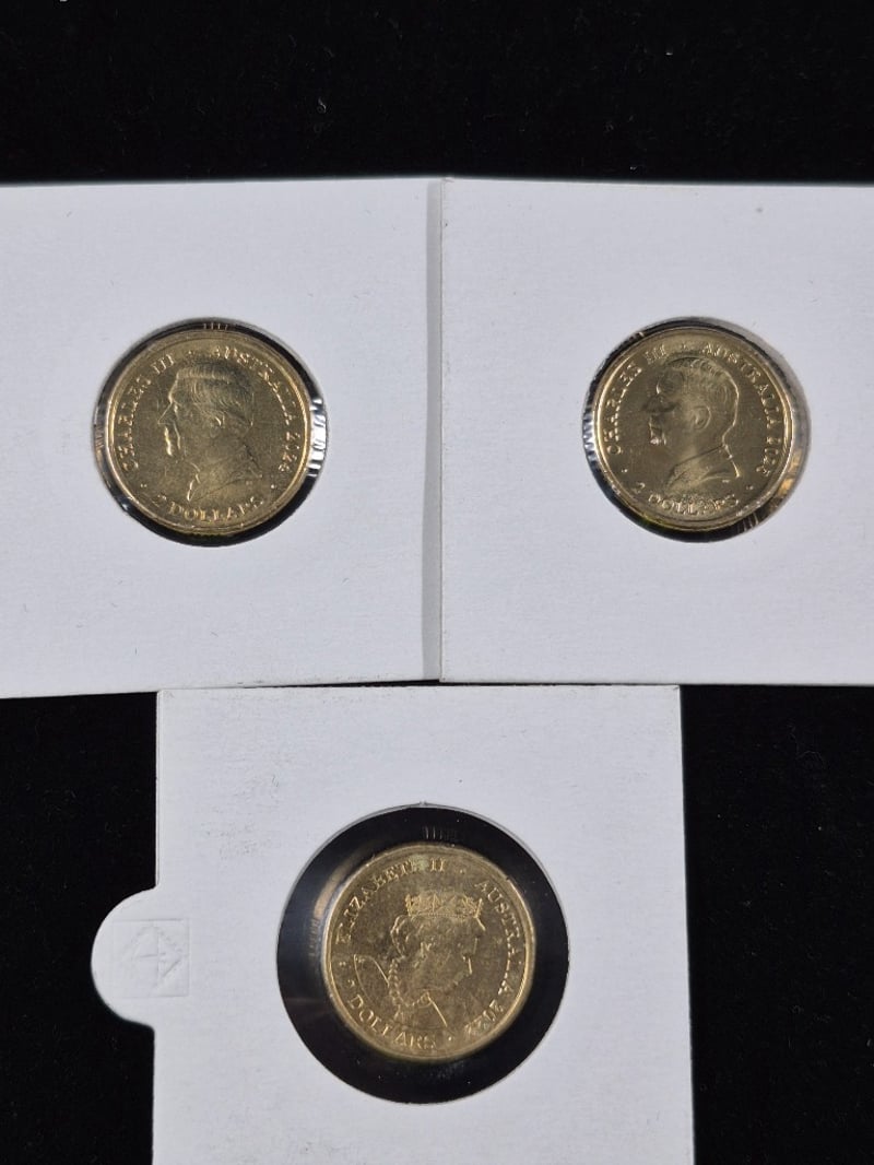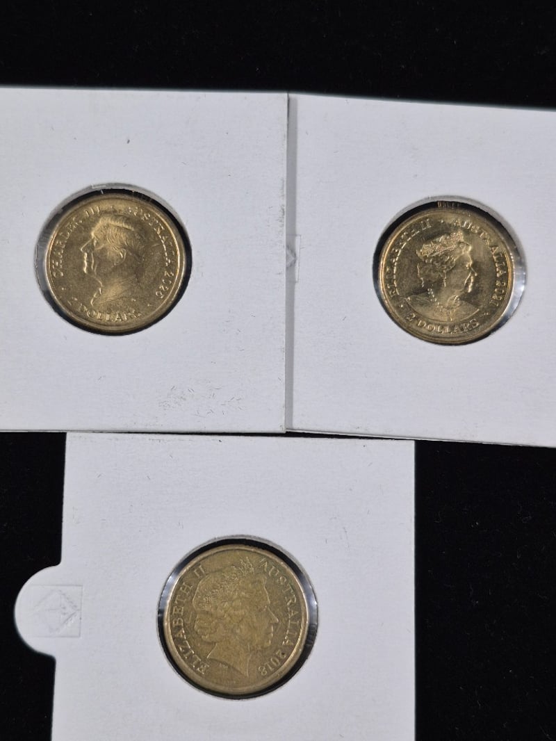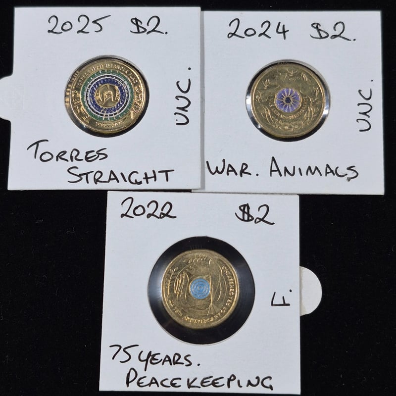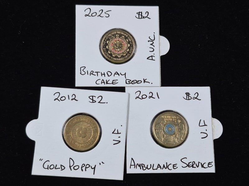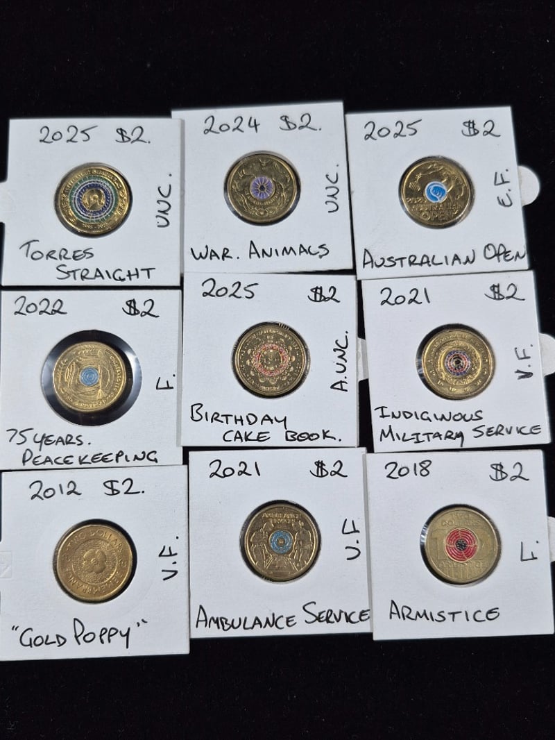 COLLECTION OF AUSTRALIAN COLOURED $2 COINS INCLUDING GOLD POPPYY, WAR ANIMALS AMBULANCE SERVICE & MORE