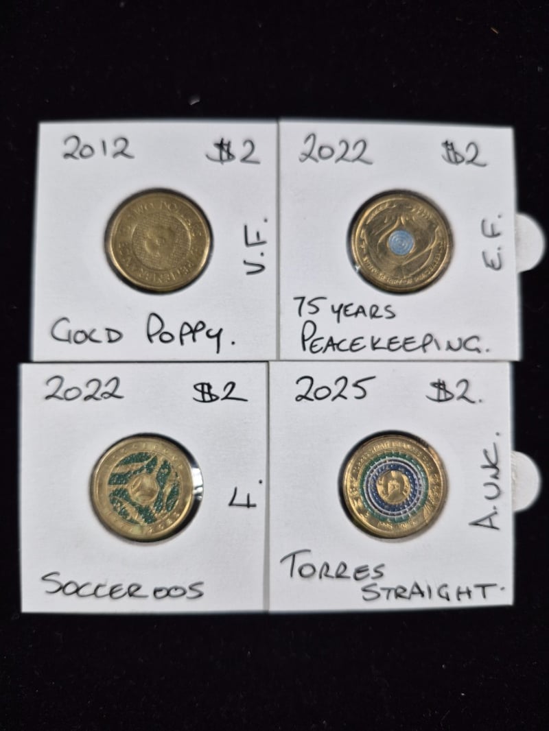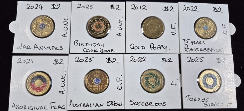 COLLECTIONS OF AUSTRALIAN COLOURED $2 COINS INCLUDING AUSTRALIAN OPEN, SOCCEROOS, ABORIGINAL FLAG & MORE 8 Coins In Total. Mixed Conditions 586380+20