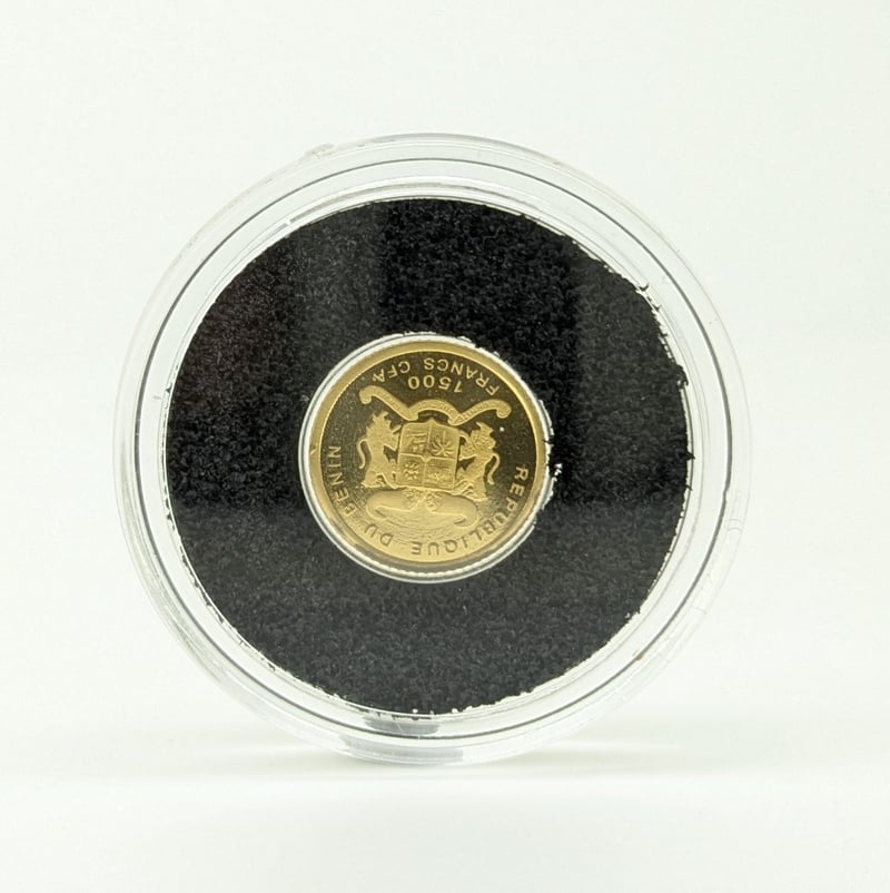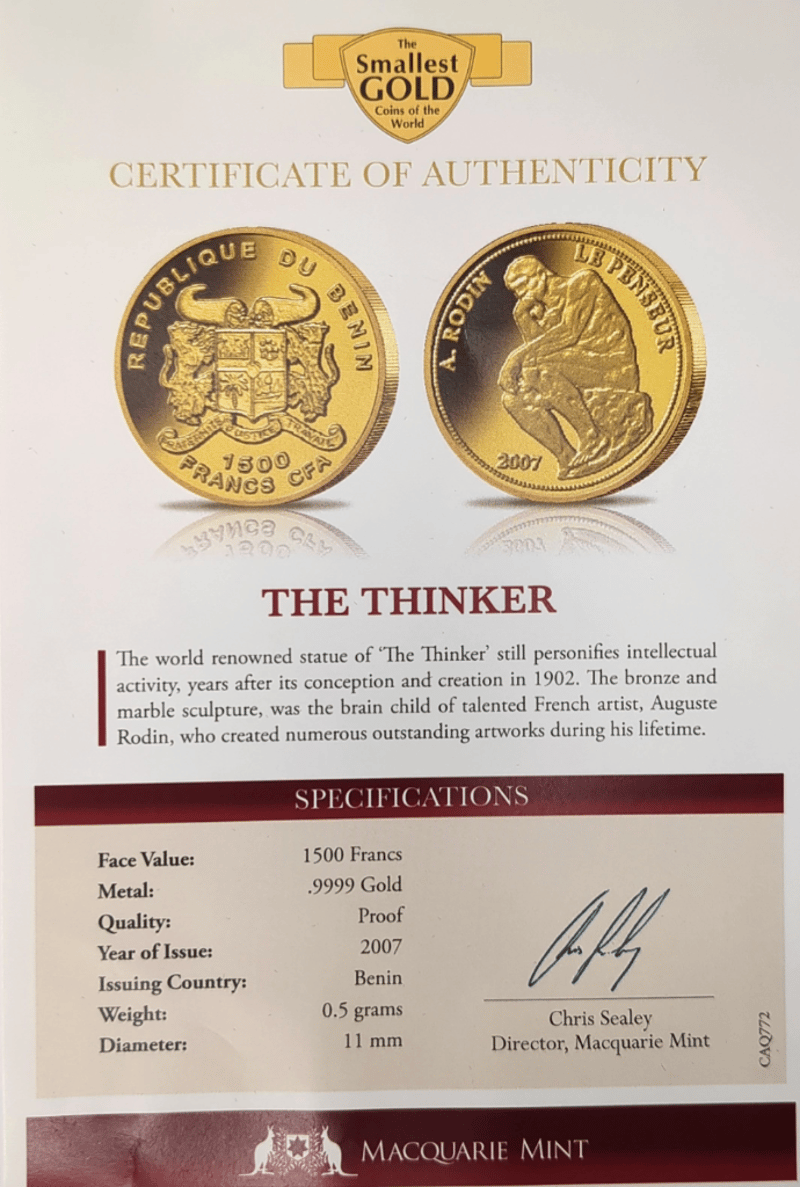 2007 BENIN 1500 FRANCS CFA GOLD COIN FEATURING RODIN'S "THE THINKER", "THE SMALLEST GOLD COINS OF THE WORLD" SERIESMetal: .9999 Gold. Weight: 0.5 Grams. Quality: Proof. Diameter: 11 Mm. Accompanied By Certificate Of Authenticity.Condition: GoodFC163078+2
