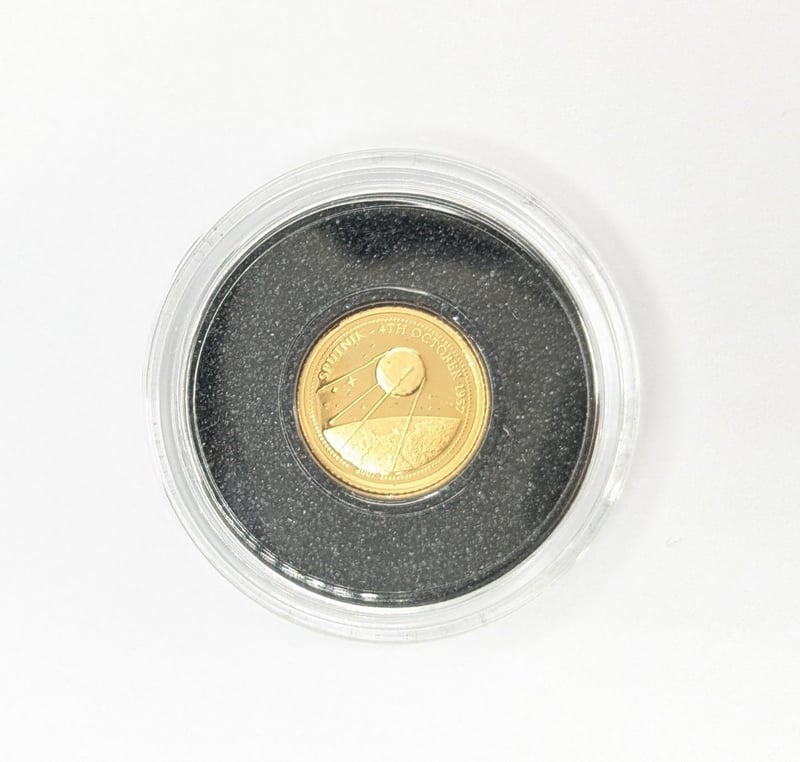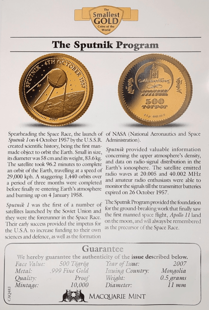 2007 MONGOLIAN 500 TOGROG GOLD PROOF COIN, "THE SMALLEST GOLD COINS OF THE WORLD" SERIES, COMMEMORATING THE SPUTNIK PROGRAM.