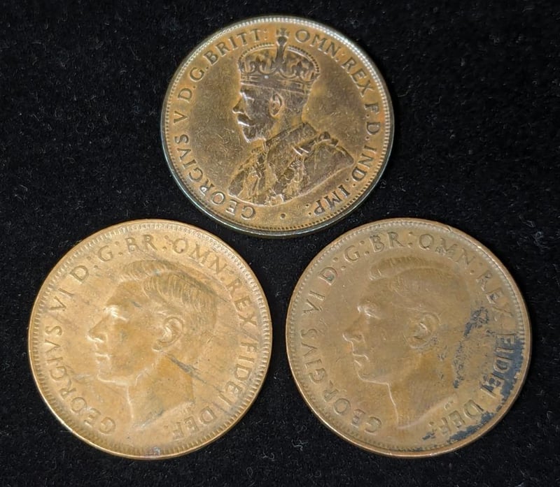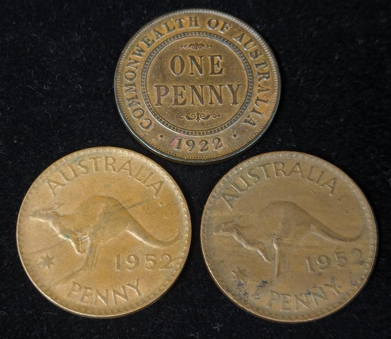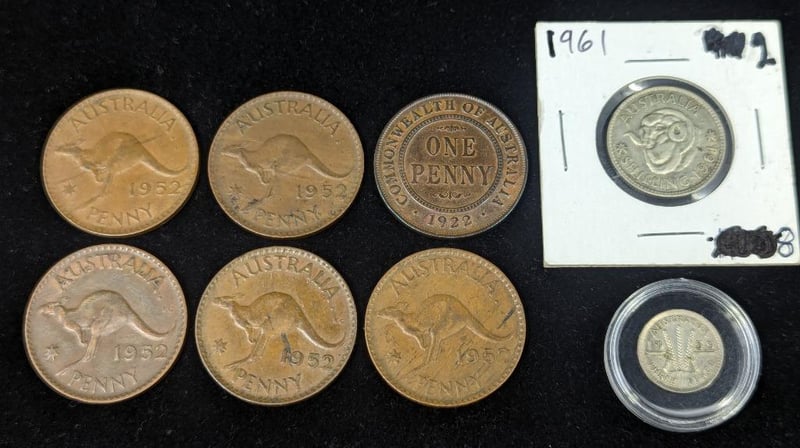 SIX AUSTRALIAN ONE PENNY COINS, 1961 SHILLING AND 1959 THREE PENCE COINIncludes 1922 One Penny And Five 1952 One Penny Coins Including Error CoinsVAULT586384+2