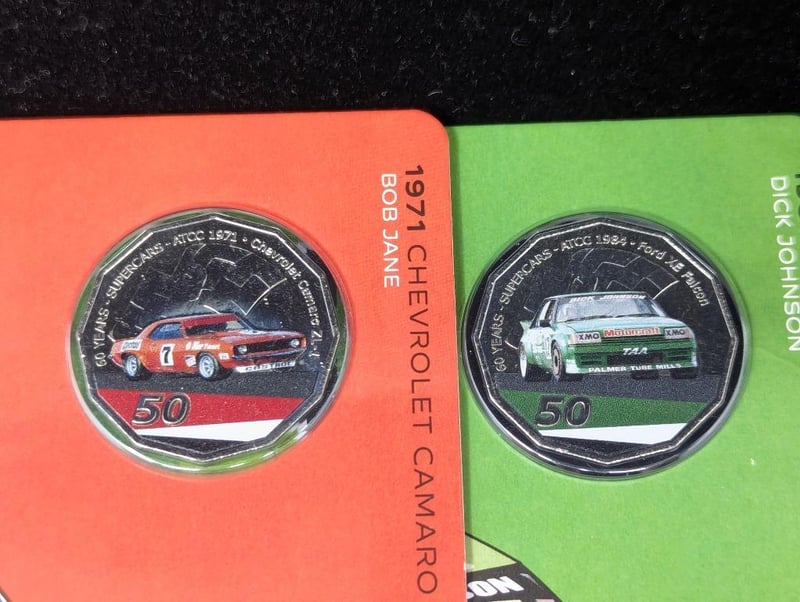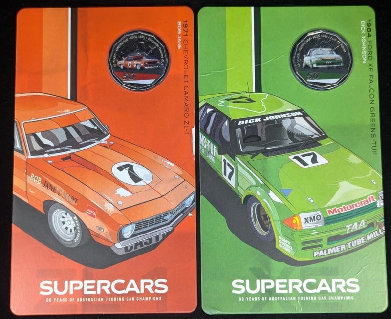 AUSTRALIAN SUPERCARS FIFTY CENT COINS IN CARDS, COMMEMORATIVE MEDALLIONS AND TOKENS