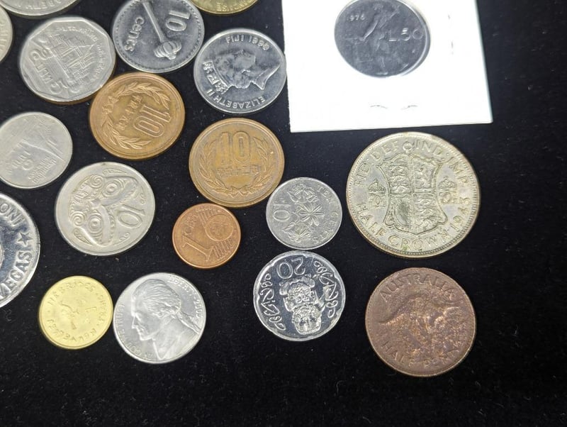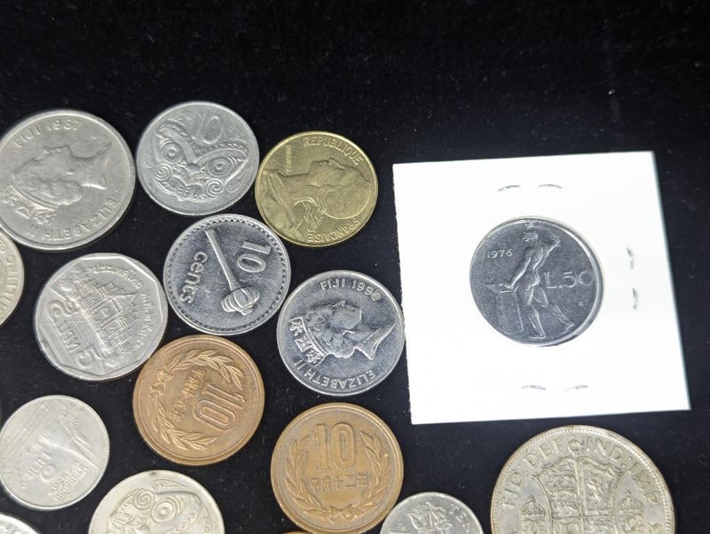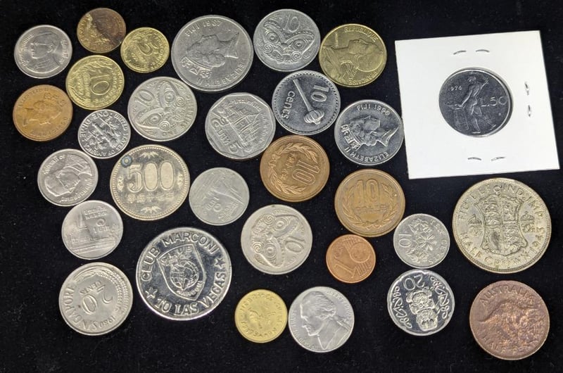 Coins Include: 1976 Italian Fifty Lira Coin, 1987 Singapore Ten Cent, Collection Of New Zealand Coins, Las Vegas Token, 2009 1 Euro Cent Coin, Etc