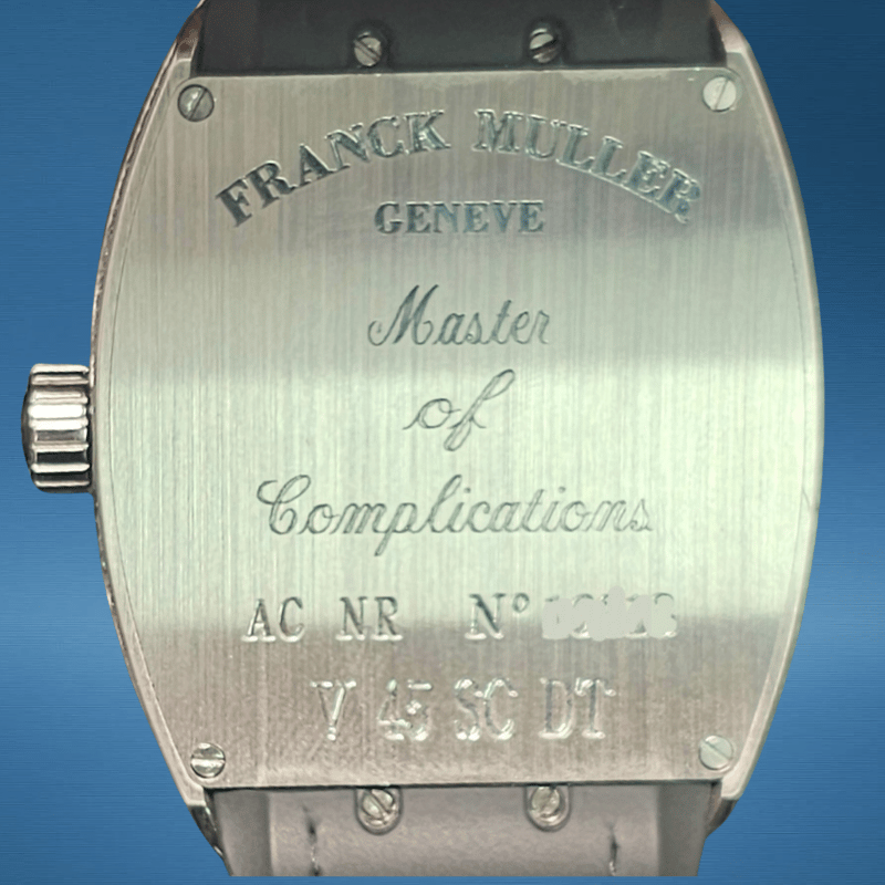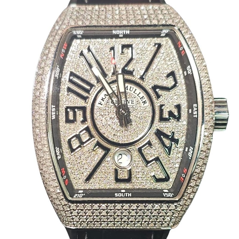 FRANCK MULLER V45 STEEL AND CUSTOM DIAMOND Brand: Franck Muller Model Number: VANGUARD Reference Number: V45 SC DT Production Year: UNKNOWN Dial: DIAMOND Case: STEEL DIAMOND Case Size: 45MM Bracelet: LEATHER Movement: AUTOMATIC Aftermarket Natural DiamondsBox: YesPapers: Yes Condition: Good - Refer to Images
