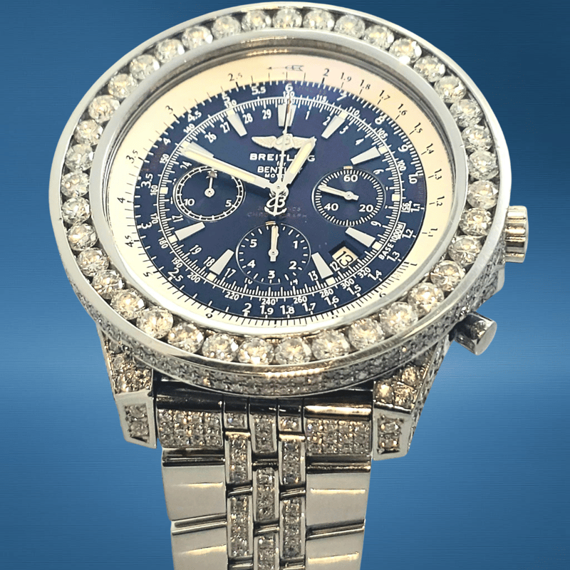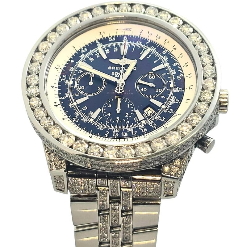 BREITLING FOR BENTLEY MOTORS CHRONOGRAPH CUSTOM DIAMOND SET Brand: Breitling Model Number: BENTLEY Reference Number: BO1 Production Year: UNKNOWN Dial: BLUE Case: STEEL/DIAMOND Case Size: 48MM Bracelet: STEEL Movement: AUTOMATIC Box: Not IncludedPapers: Not Included Condition: Good - Refer to Images