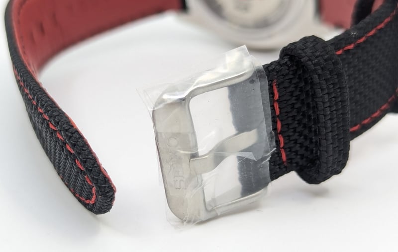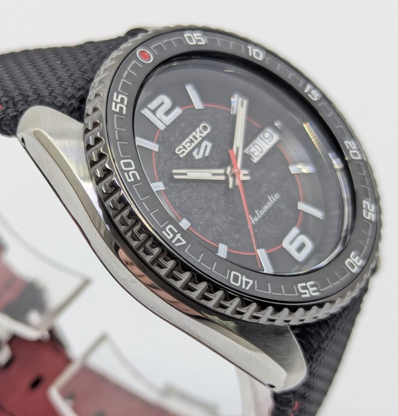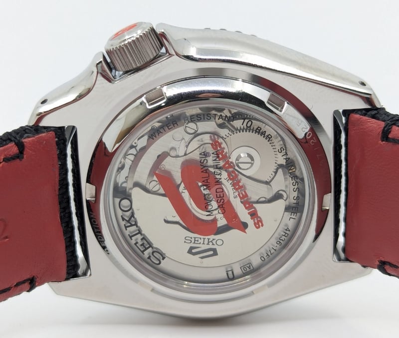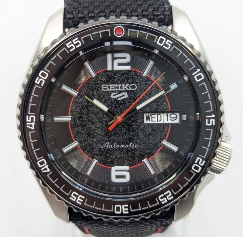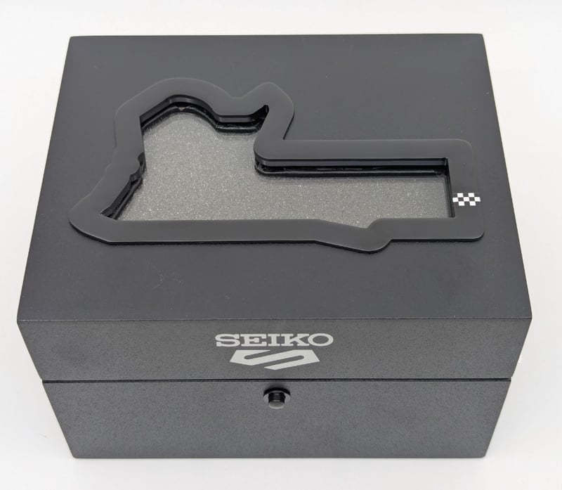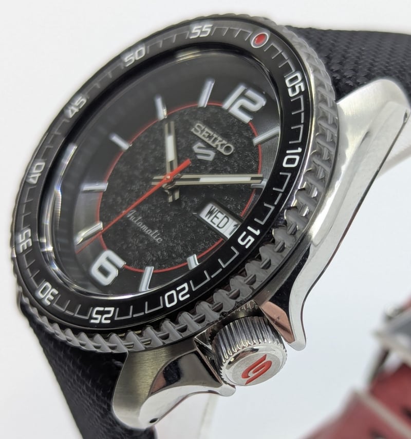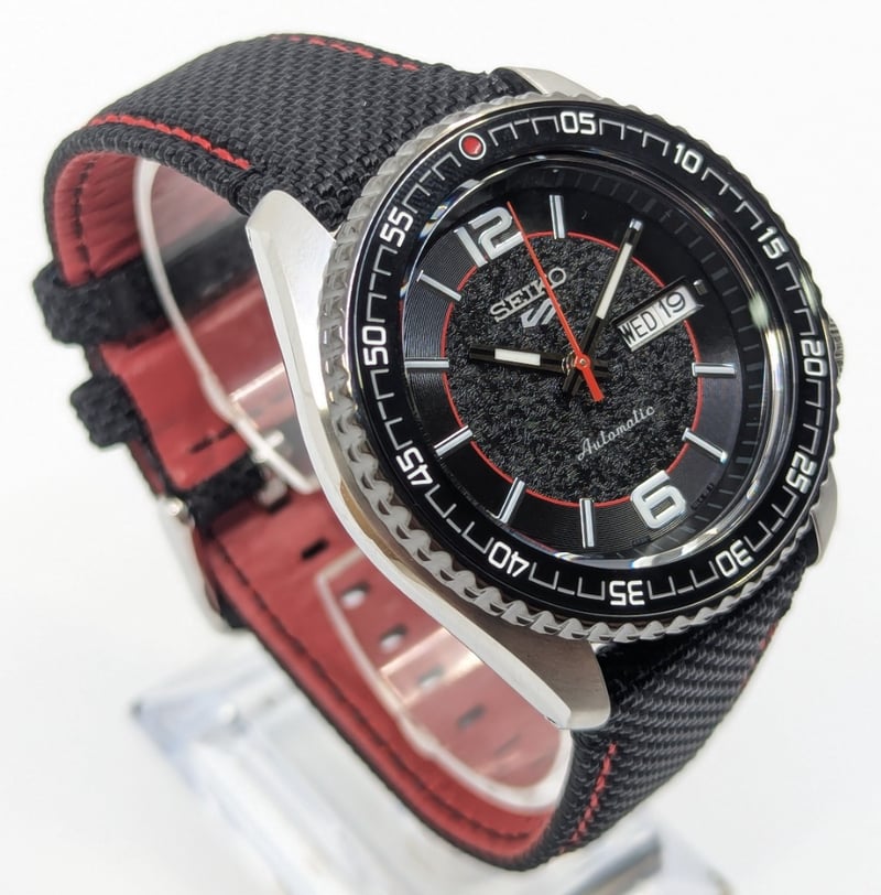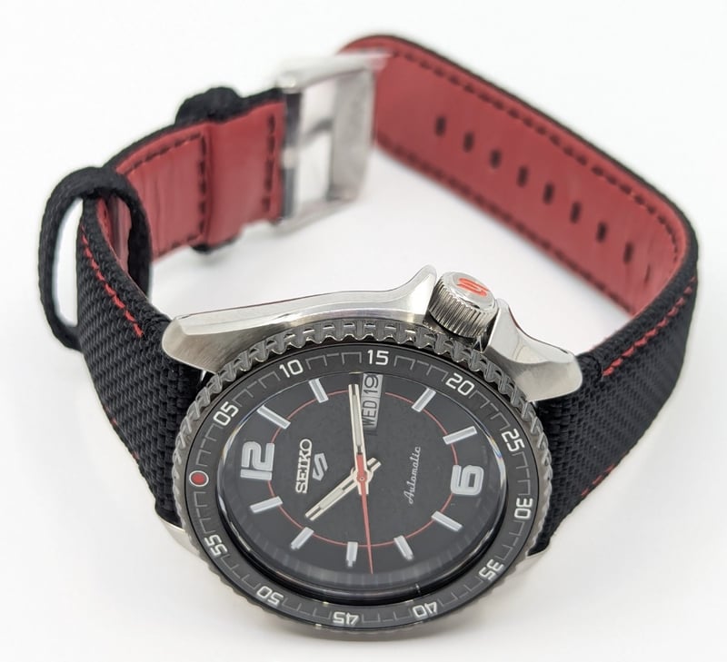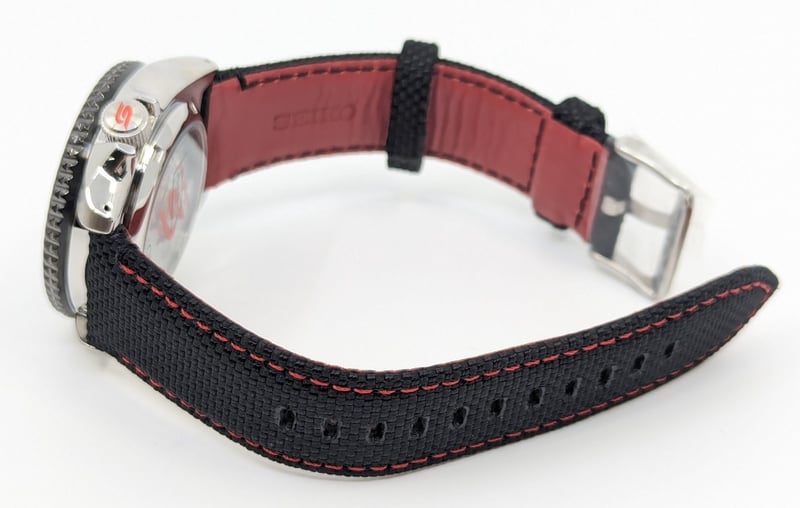 SEIKO SUPERCARS DIAL: BLACK DIAL CASE DESCRIPTION: STAINLESS STEEL CASE SIZE: 42MM BRACELET: LEATHER AND CANVAS BRACELET MOVEMENT: AUTOMATIC BOX: INCLUDED PAPERS: NOT INCLUDED Condition: Good - Refer To Images Additional Information: Arabic Numeral Hour Markers At 12 And 6 O'Clock Positions Luminous Hands And Hour Markers Date Display At 3 O'Clock Position Exhibition Case Back Buckle Clasp Water Resistant: 10 Bar VAULT 586375+19