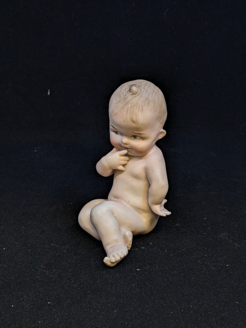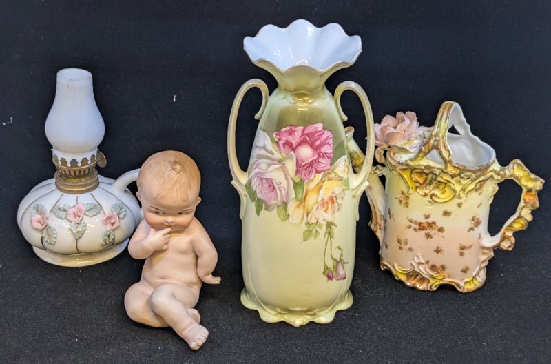 COLLECTION OF DECORIncludes Gebruder Heubach Bisque Baby Sculpture, Porcelain Water Can, Porcelain Mini Oil Lamp, EtcCondition: Good - Refer To Images585040+13
