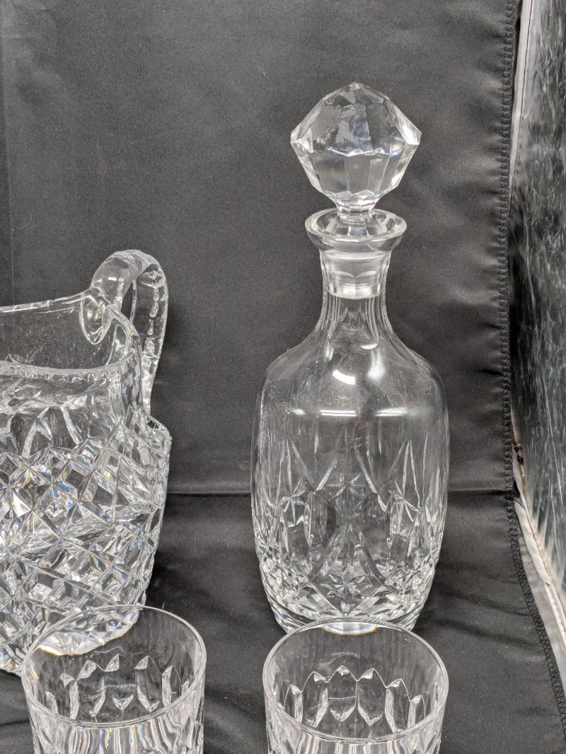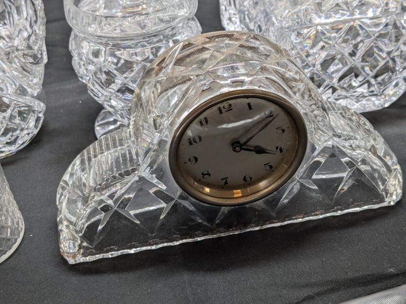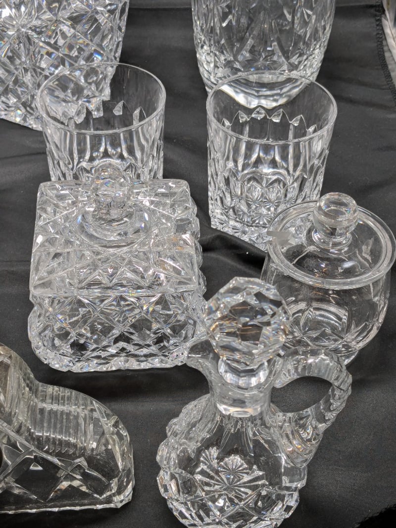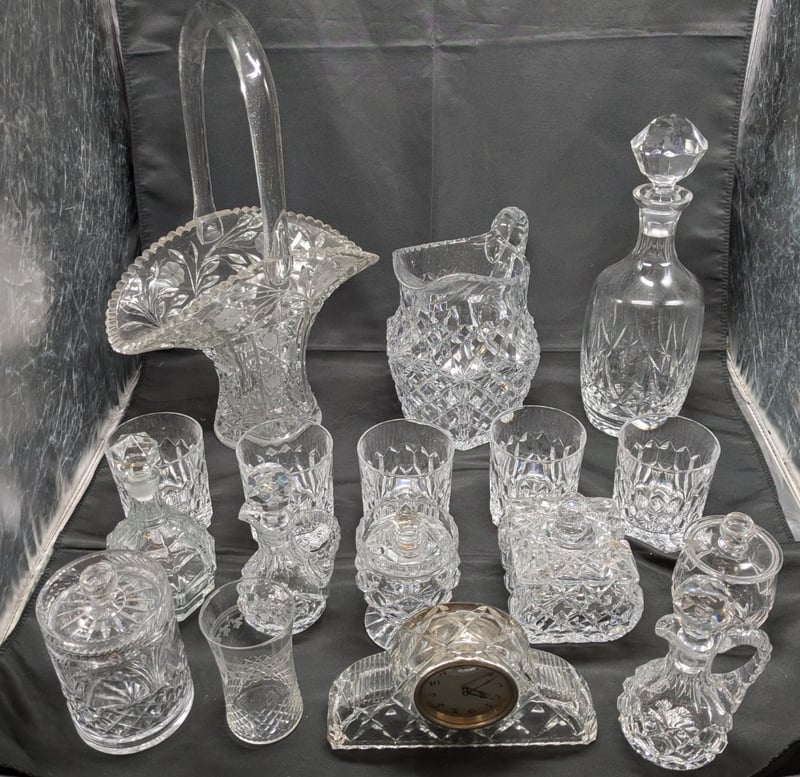 Includes Mantel Glass Clock, Various Decanters, Glass Jars, Whiskey Glasses, Etc