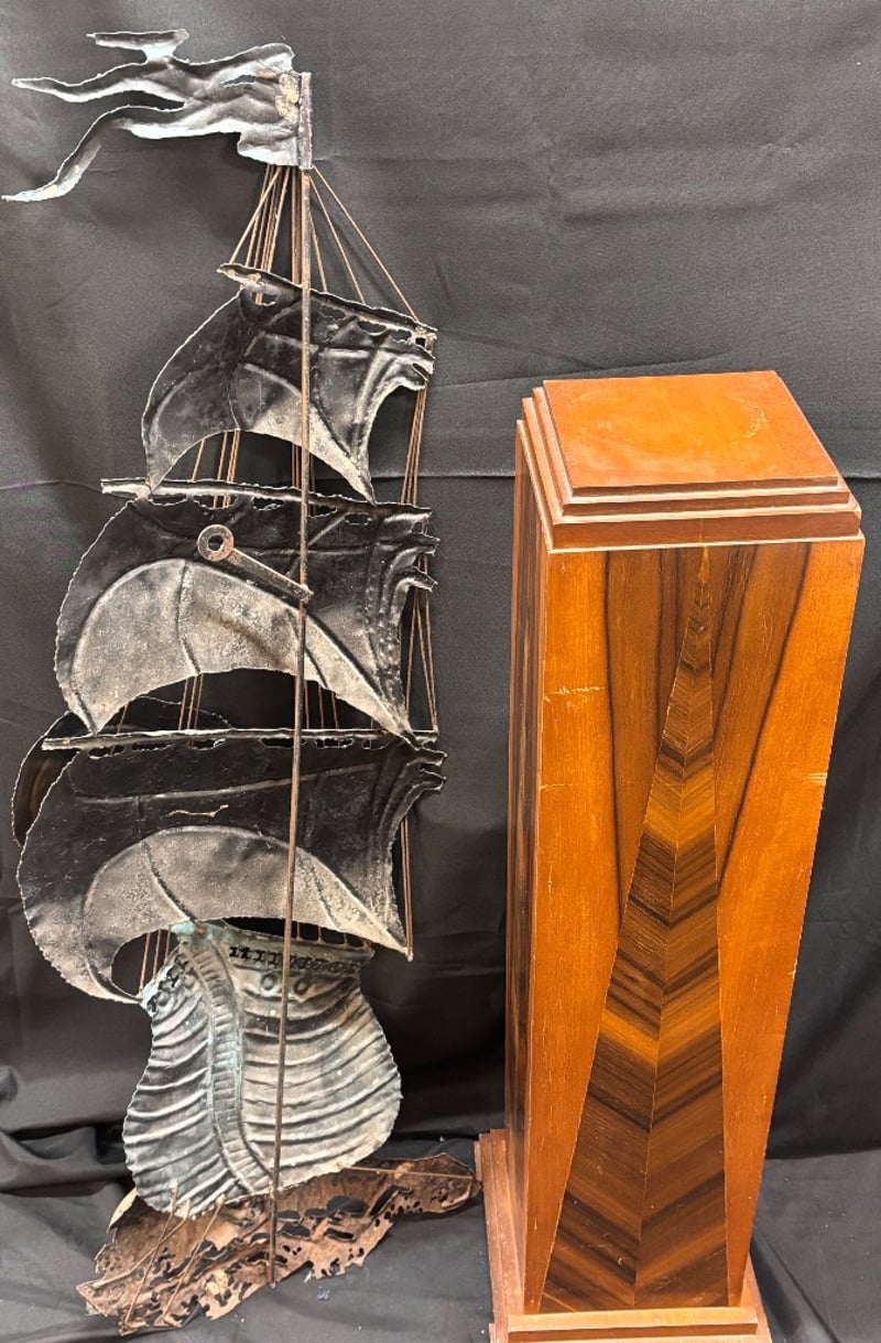 WOODEN PODIUM AND IRON SAILING SHIP SCULPTURE.