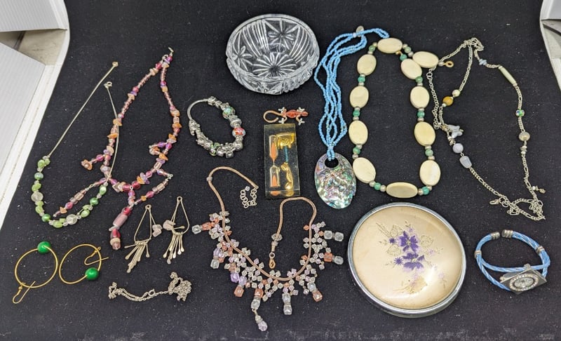 Jewellery Pieces Include Necklaces, Watch, Earrings, Charm Bracelet, Etc, Decorative Glass Bowl With Embroidered Floral Design On Lid, Hour Glass And Telephone In Acrylic