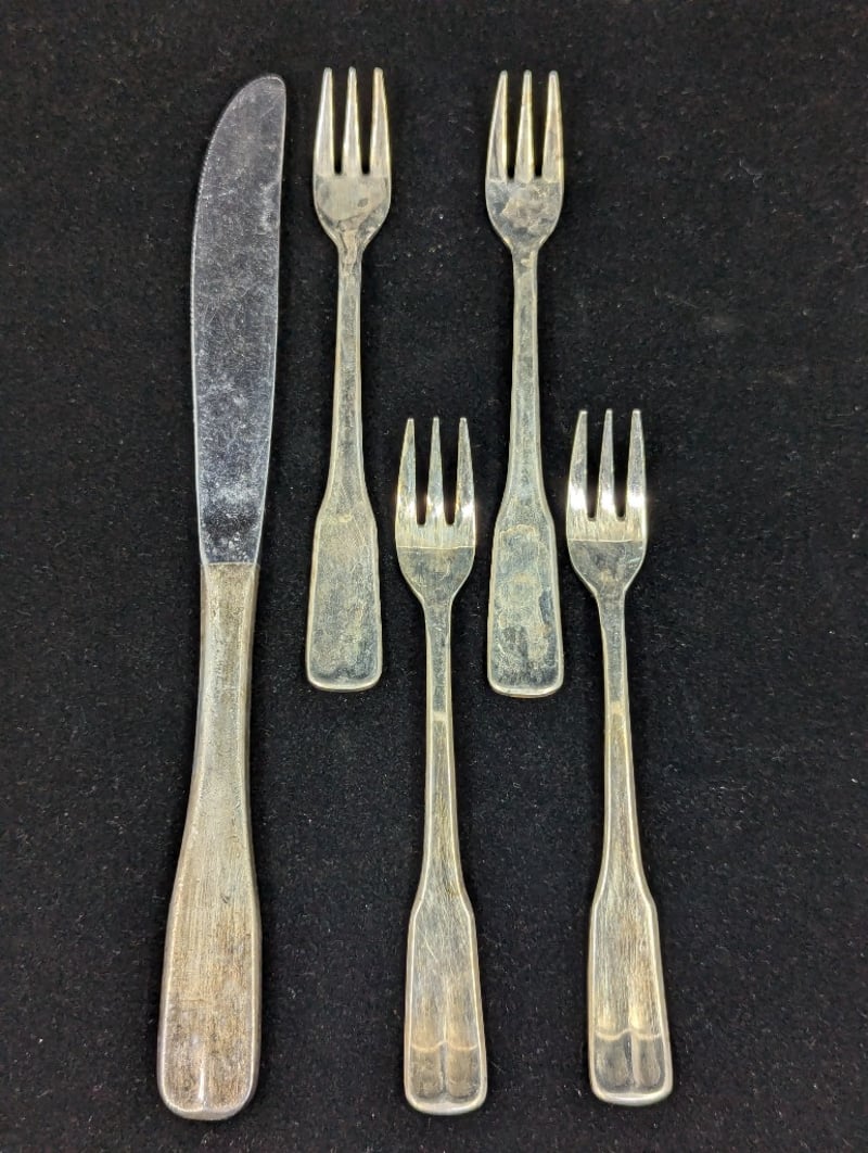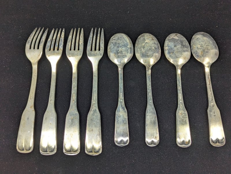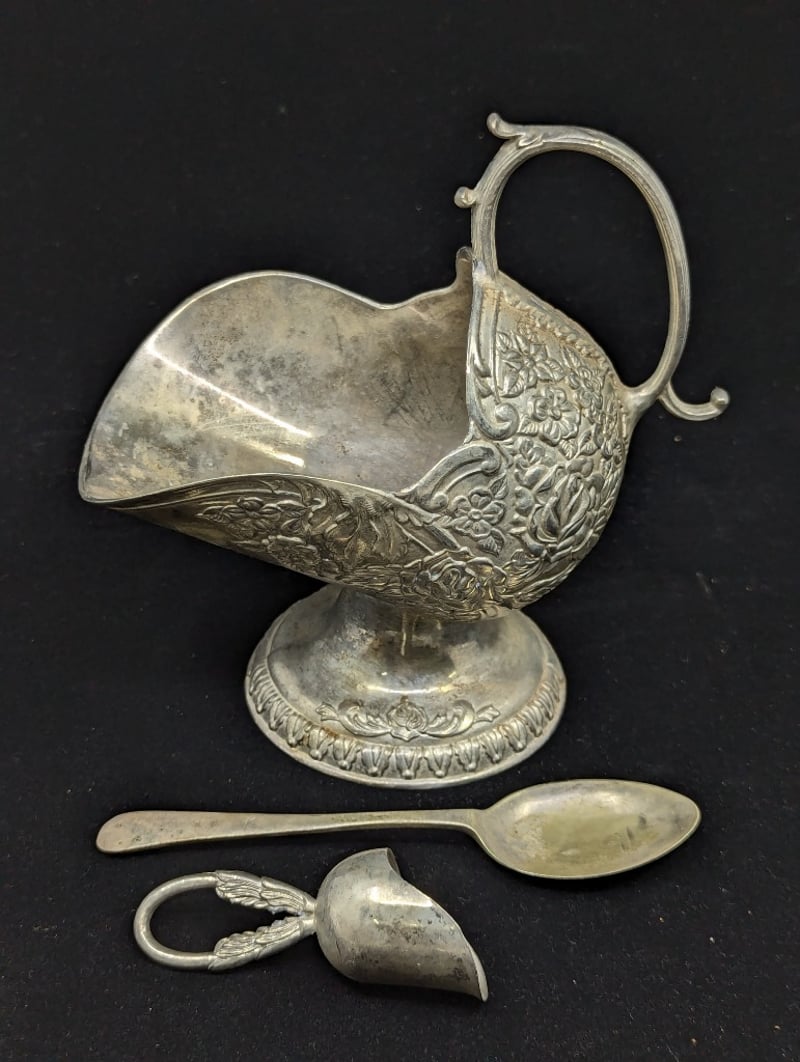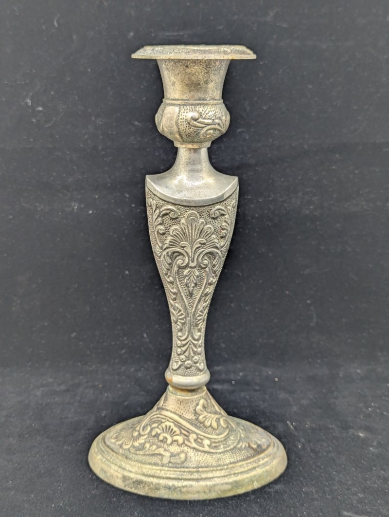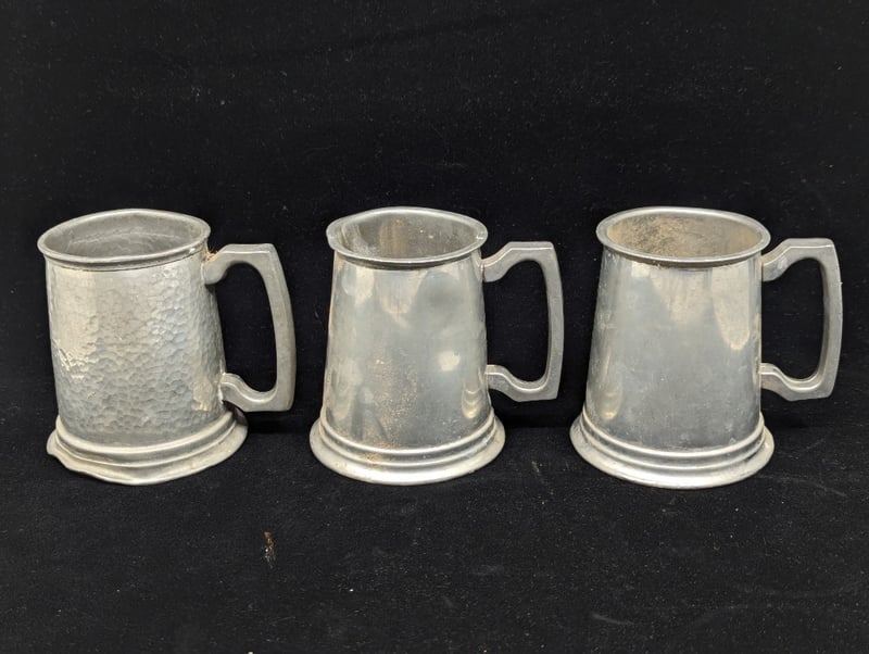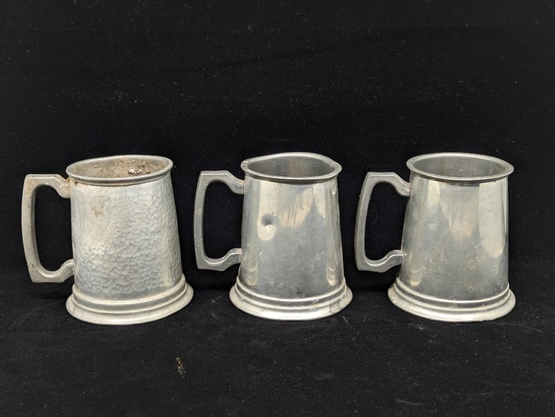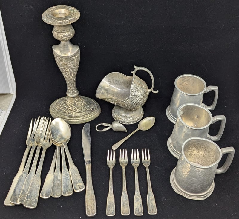 Items Include Three Pewter Mugs, Candlestick Holder, Pot With Floral Engraved Design On Exterior, Collection Of Cutlery Items