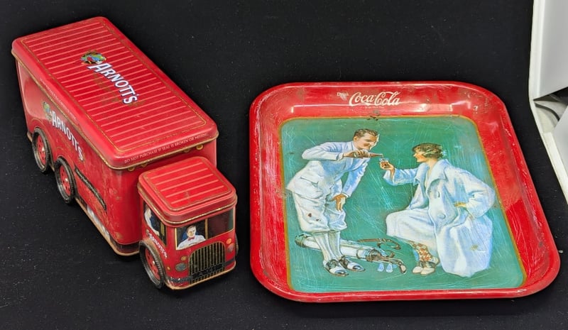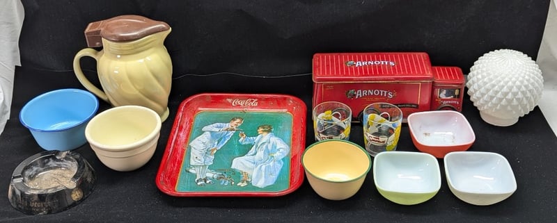 Includes Collectable Items Including Arnotts Truck Biscuit Tin, Coca Cola Tray, Two Simpsons Nutella Glasses, King George Old Scotch Whiskey Ash Tray, Collection Of Bowls And Nilsen Porcelain Jug