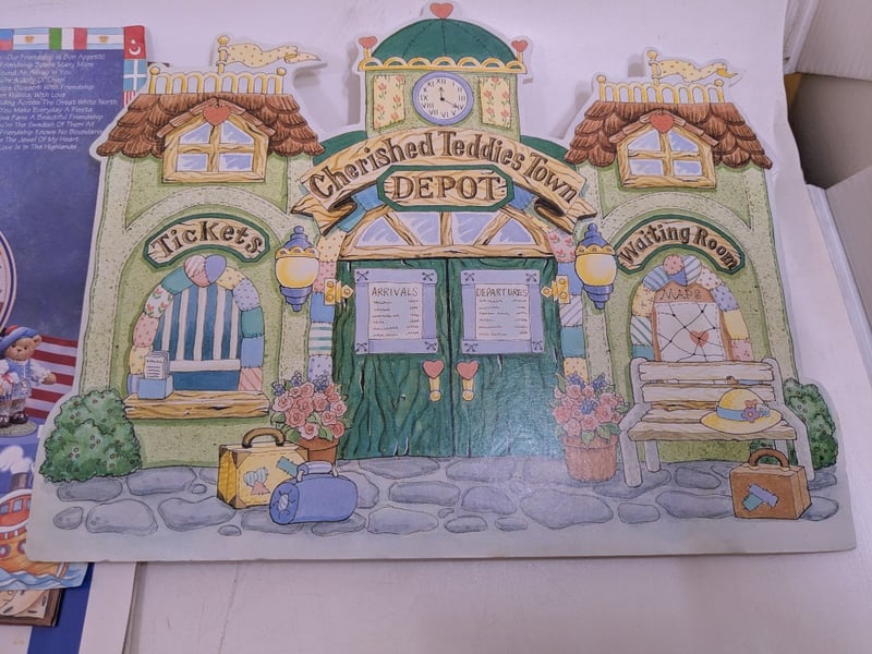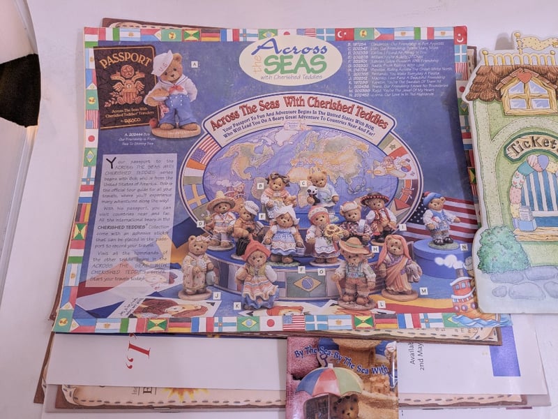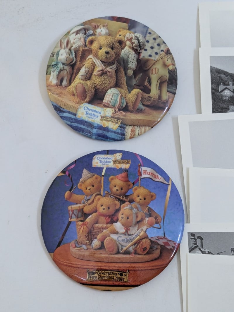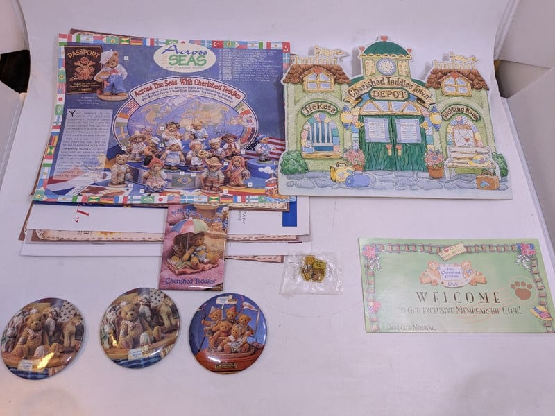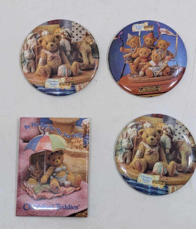 COLLECTION OF CHERISHED TEDDIES BADGES AND ACCESSORIES AND POSTCARDS