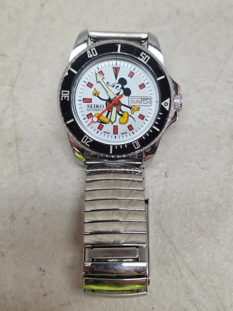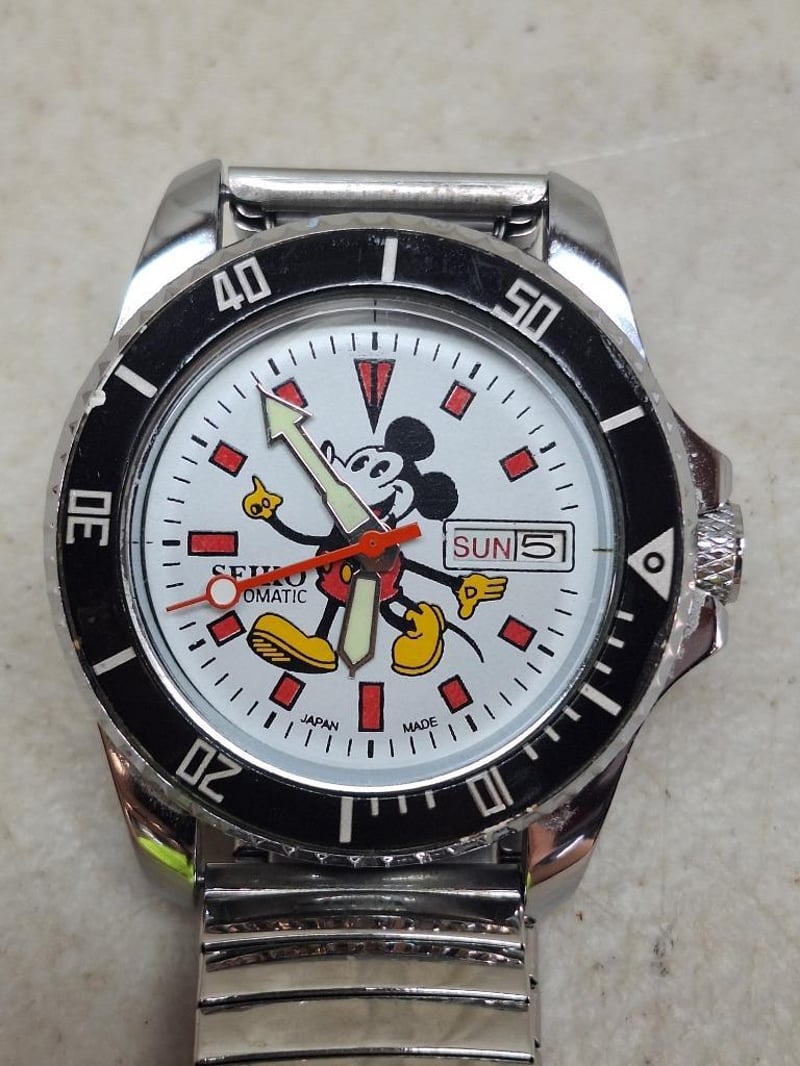 1x SEIKO Micky Mouse watch, white dial and black frame, silver-tone hardware and elastic wristband