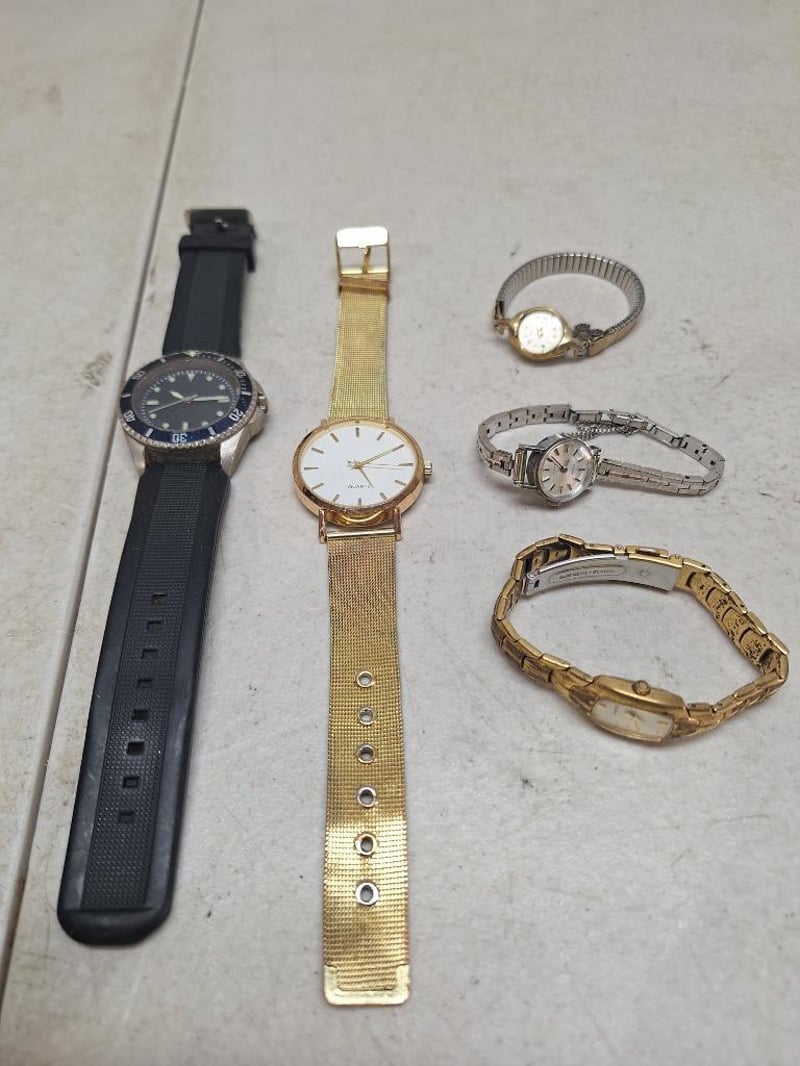 1x SEIKO 1967 woman's stainless steel watch, white dial and gold plated silverware, 1x TISSOT silver-tone woman's watch, stylist silver-tone dial and hardware vintage style, 2x woman's gold plated watch, 1x men's UK ROYAL NAVY SBS watch, dark blue dial and silver-tone hardware with rubbber band