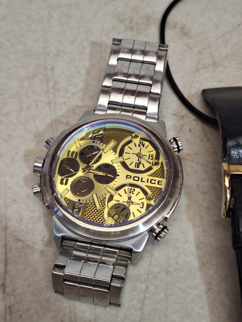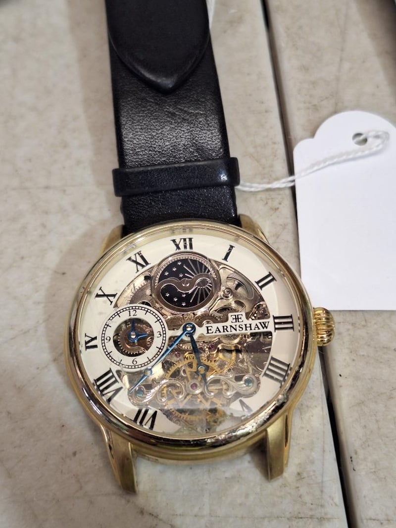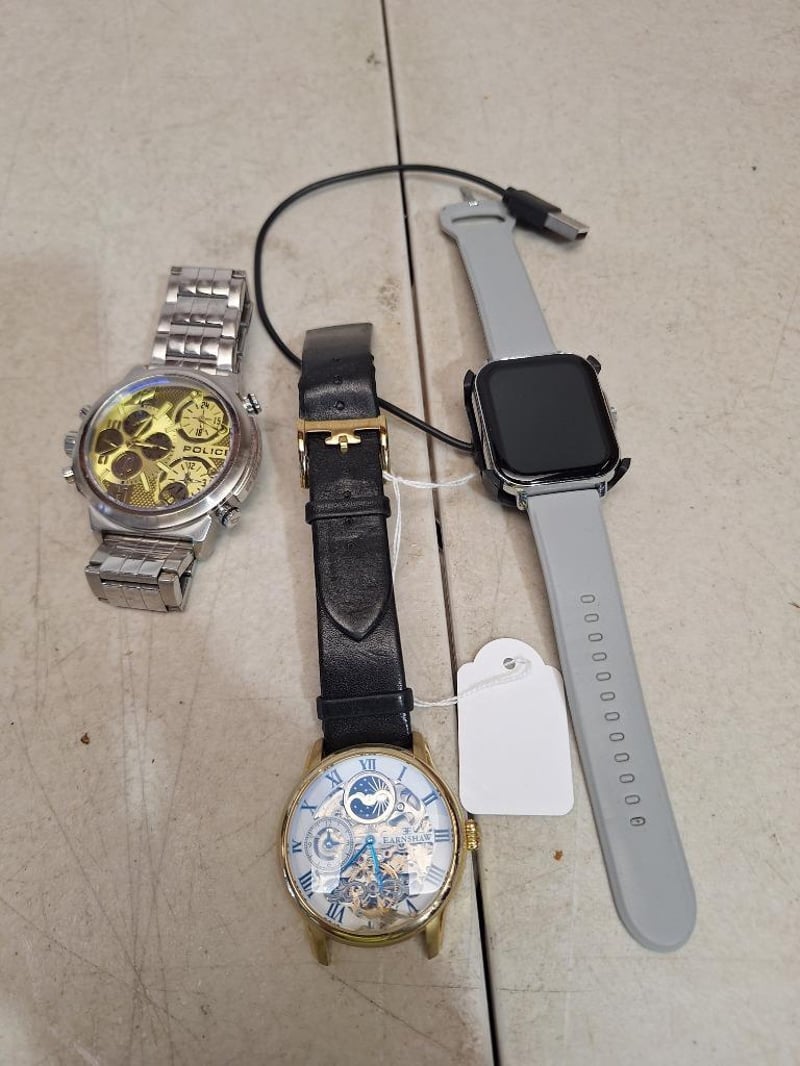1 x Earnshaw Automatic watch, skeleton dial with Roman numeral hour markers, black leather strap (missing pin), 1 x Police Chronograph watch, 50mm dial, stainless steel bracelet with push button deployment clasp, 1 x Smart watch with charger.