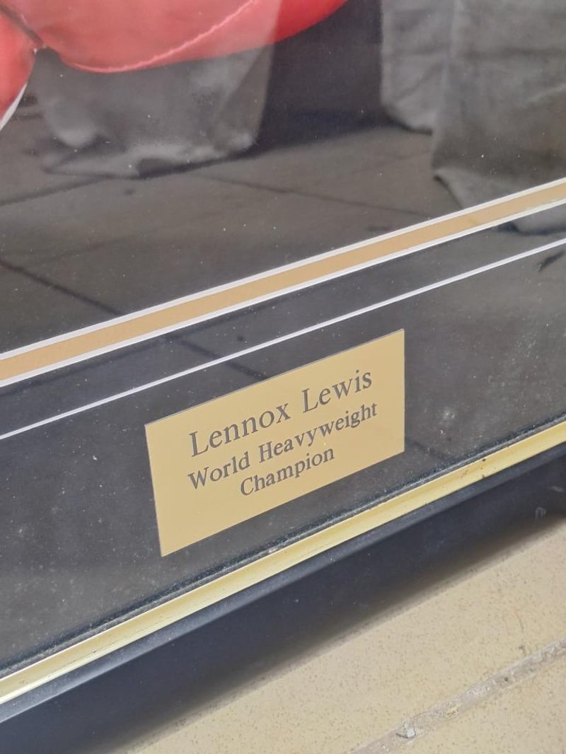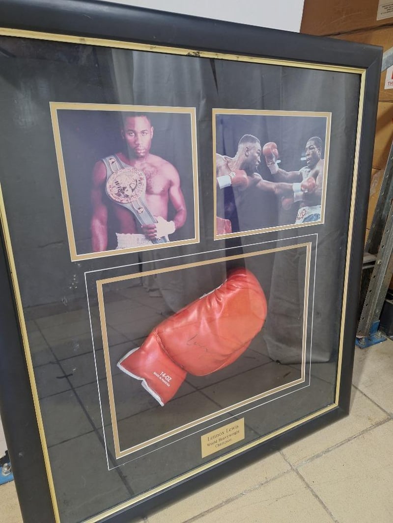 Lennox Lewis World Heavy Weight Signed Boxing Glove, black wooden frame measures 71 x 80cm.