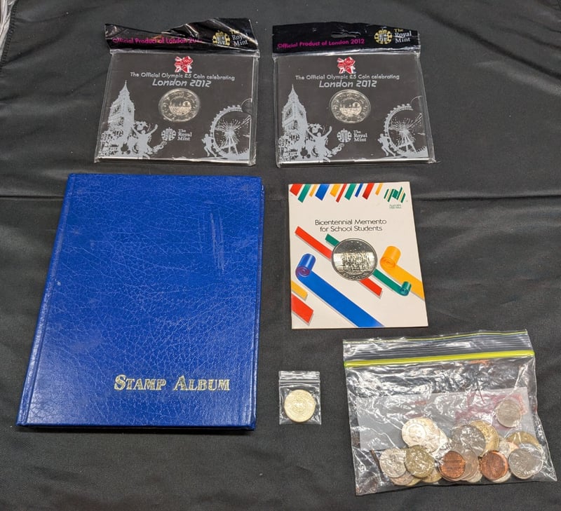 Includes Two Royal Mint 2012 London Olympics Coins, 1788-1888 Australian Bicentenary Coin, Stamp Book, And Collection Of Coins Varying From New Zealand, America, Etc