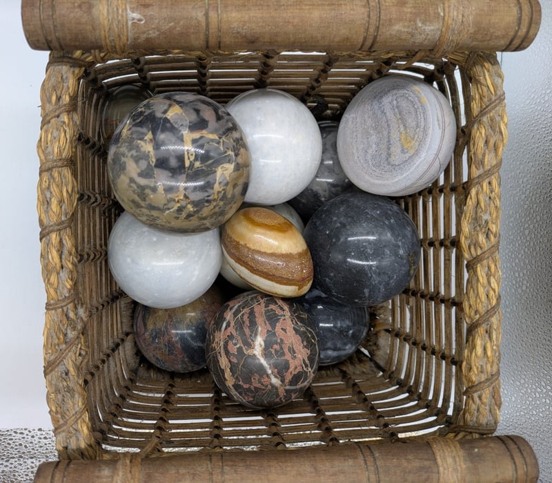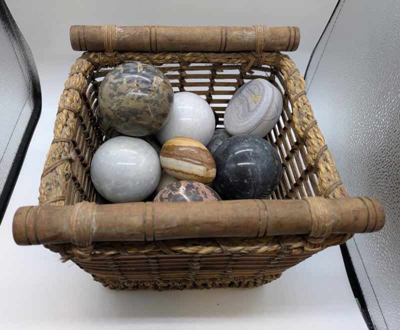 Basket with Various Decorative Spheres and Other Rock Shapes. Sold as Lot.