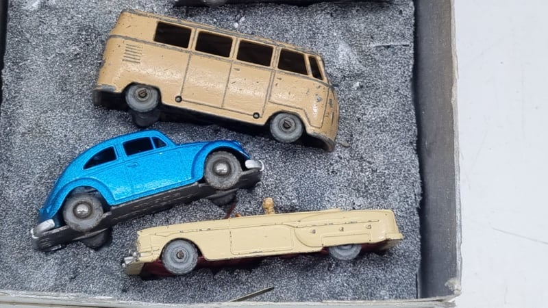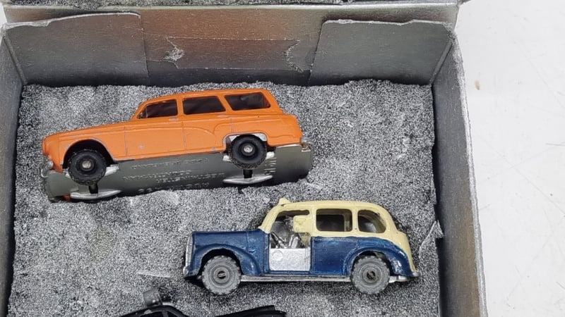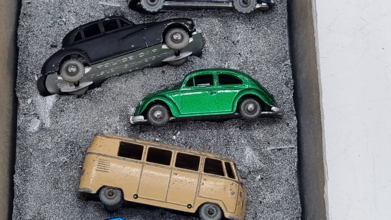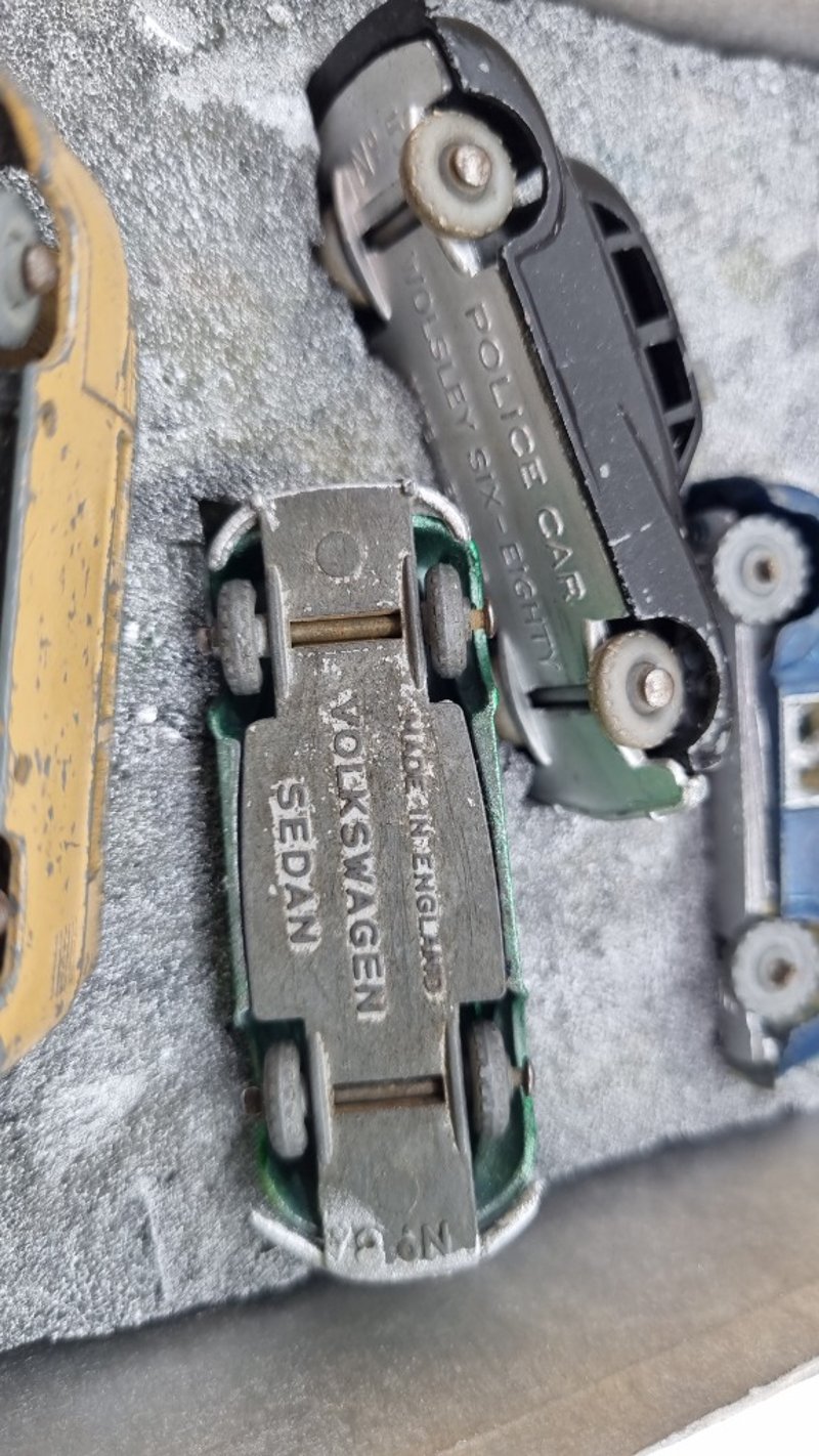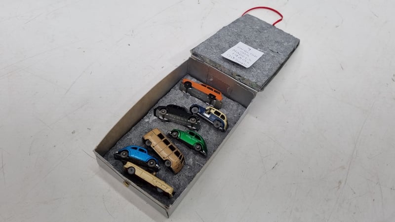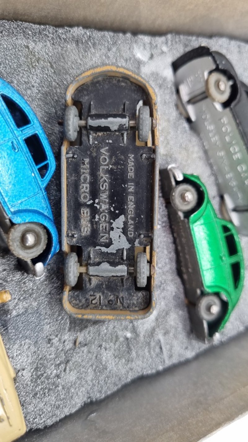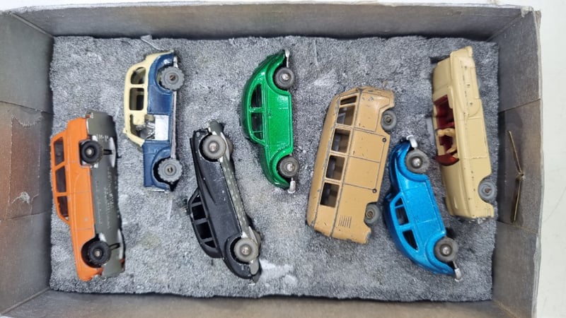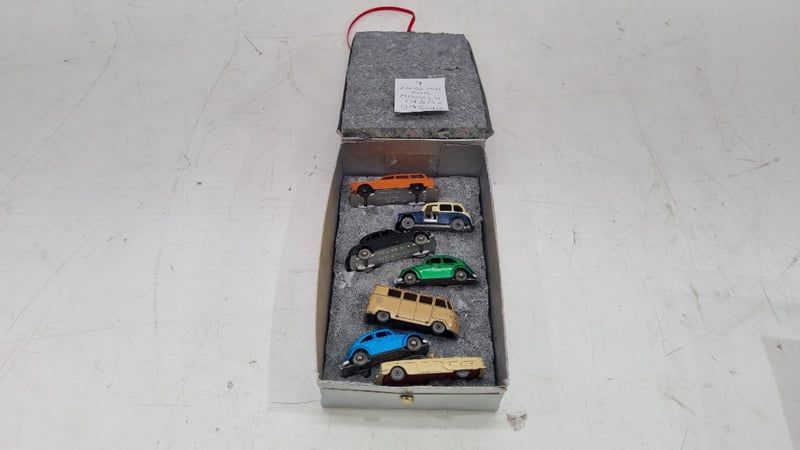Collection Of 00-Scale Die Cast Model Cars Circa 1950s Made In England includes Austin TaxiCab, Countryman, Police Car, Volkswagen Beetles In Blue and Green, Split Window Kombi And Packard Convertible